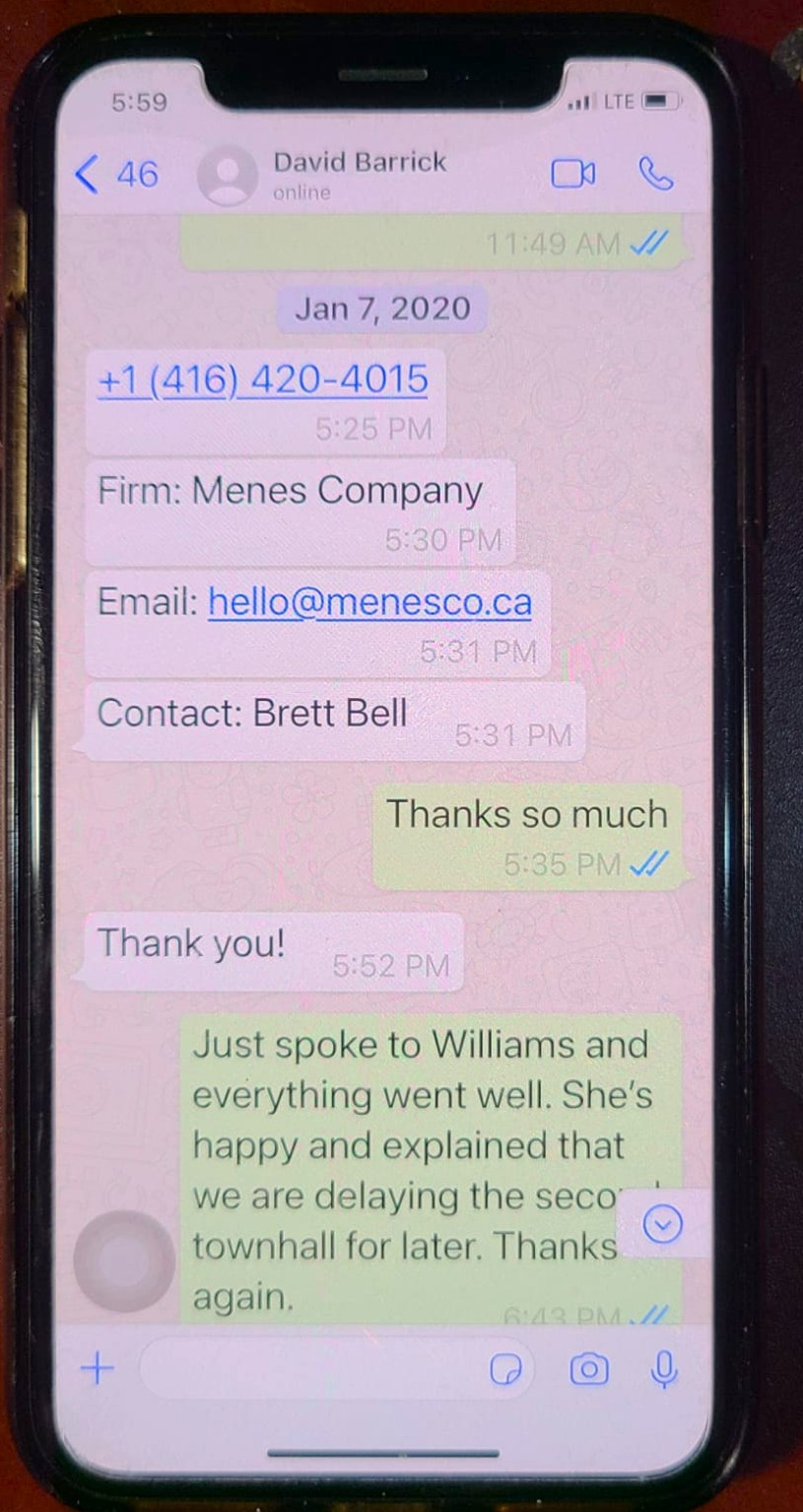 She provided text messages from Barrick sent by him on January 7, 2020. The texts show the CAO sent Kaur the name of the company and its email address. “Contact: Brett Bell” Barrick writes in the next text, and then “Thank You!”