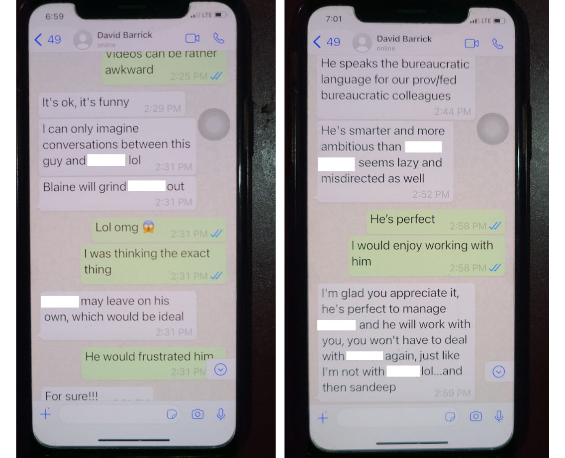 In a series of text messages Barrick sent to Kaur, he says Lucas is “smarter and more ambitious than [former employee], [former employee] seems lazy and misdirected as well.” In an earlier text Barrick says, “Blaine will grind [former employee] out,” and “[former employee] may leave on his own, which would be ideal.”