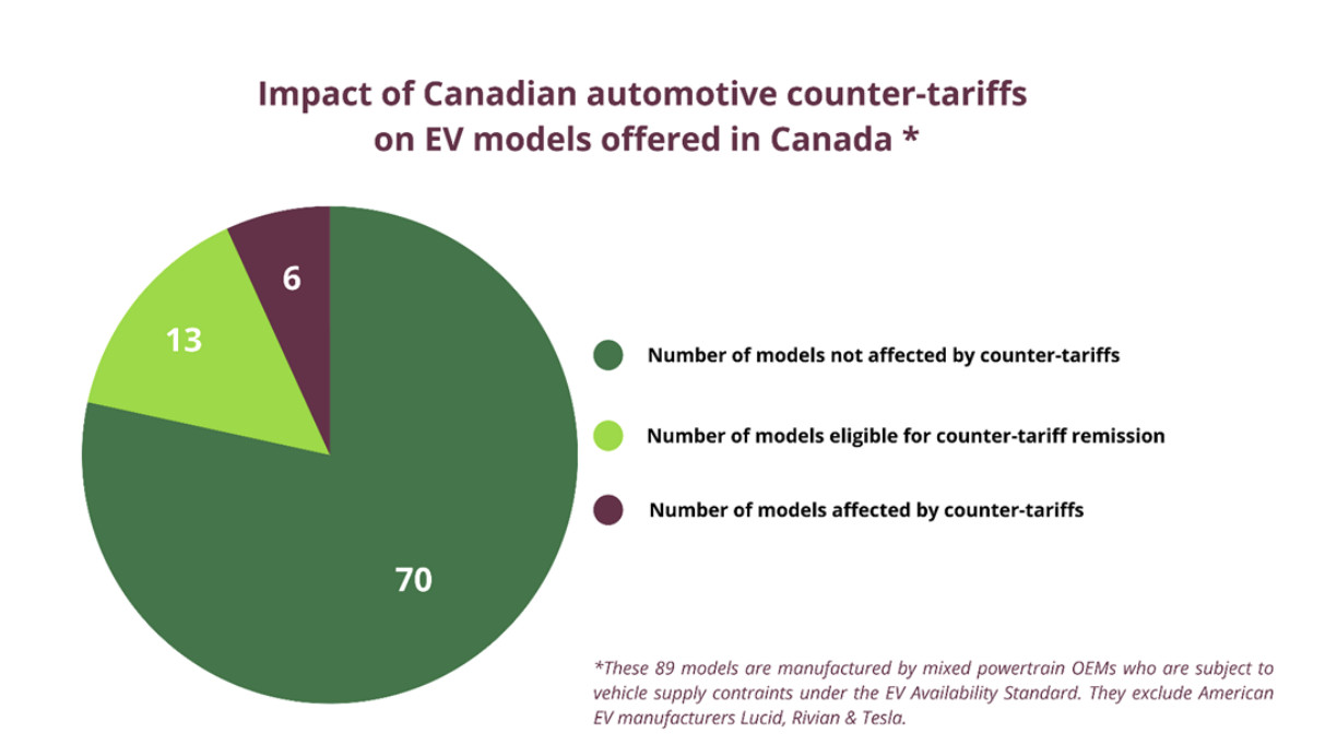 A May 2025 study by Electric Mobility Canada found that out of 89 battery electric and plug-in hybrid models offered by 33 automakers in Canada, only six are impacted by the federal automotive counter-tariffs, representing less than seven percent of available models and under five percent of total EV sales in 2024.