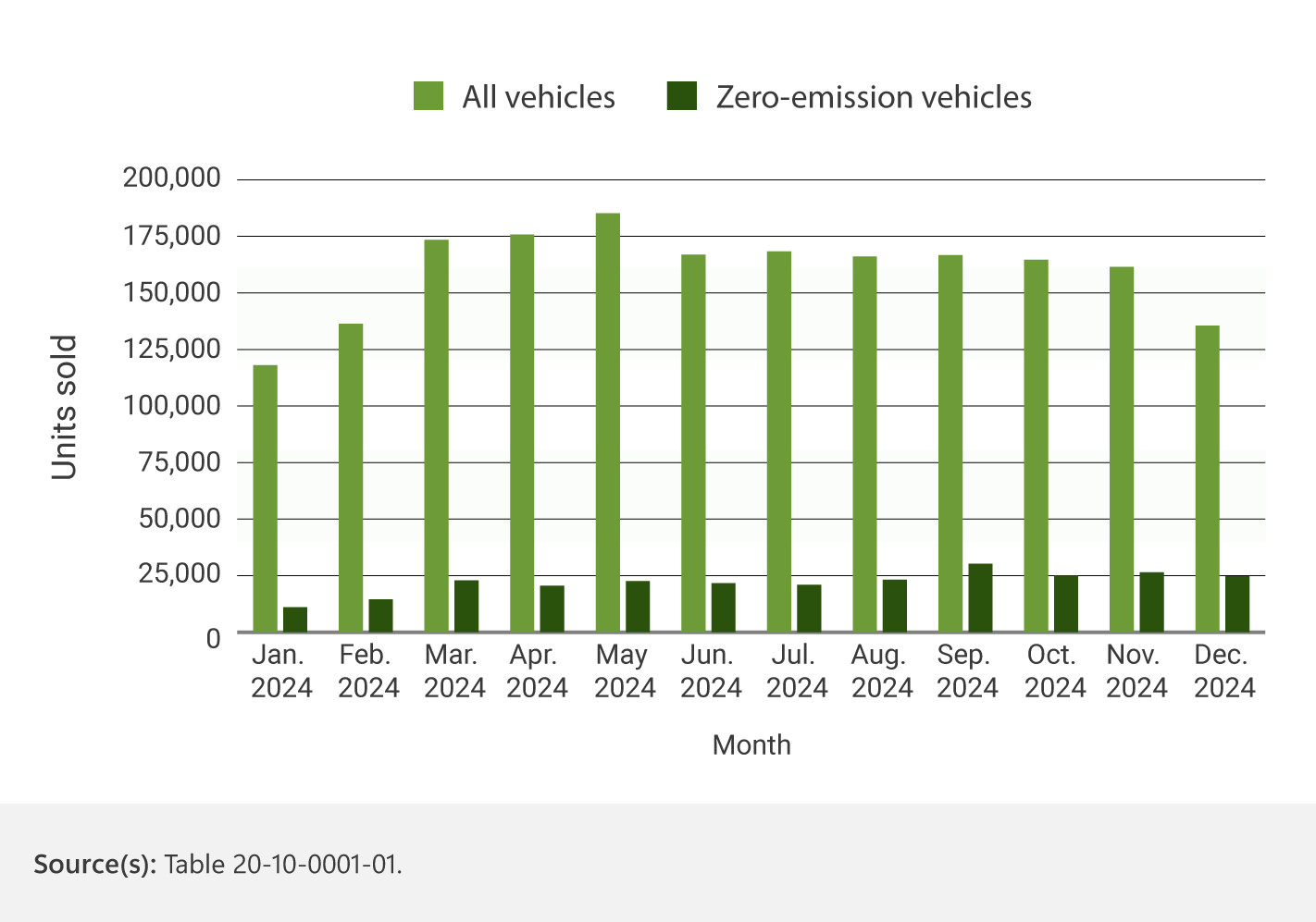 In 2024, approximately one in seven new vehicles sold in Canada (13.8 percent) was a zero-emission vehicle (ZEV), according to Statistics Canada. More than 264,000 ZEVs were purchased that year, valued at $17.3 billion. Sales were noticeably stronger in the second half of the year, peaking in September with 30,318 cars sold as new models entered the market.