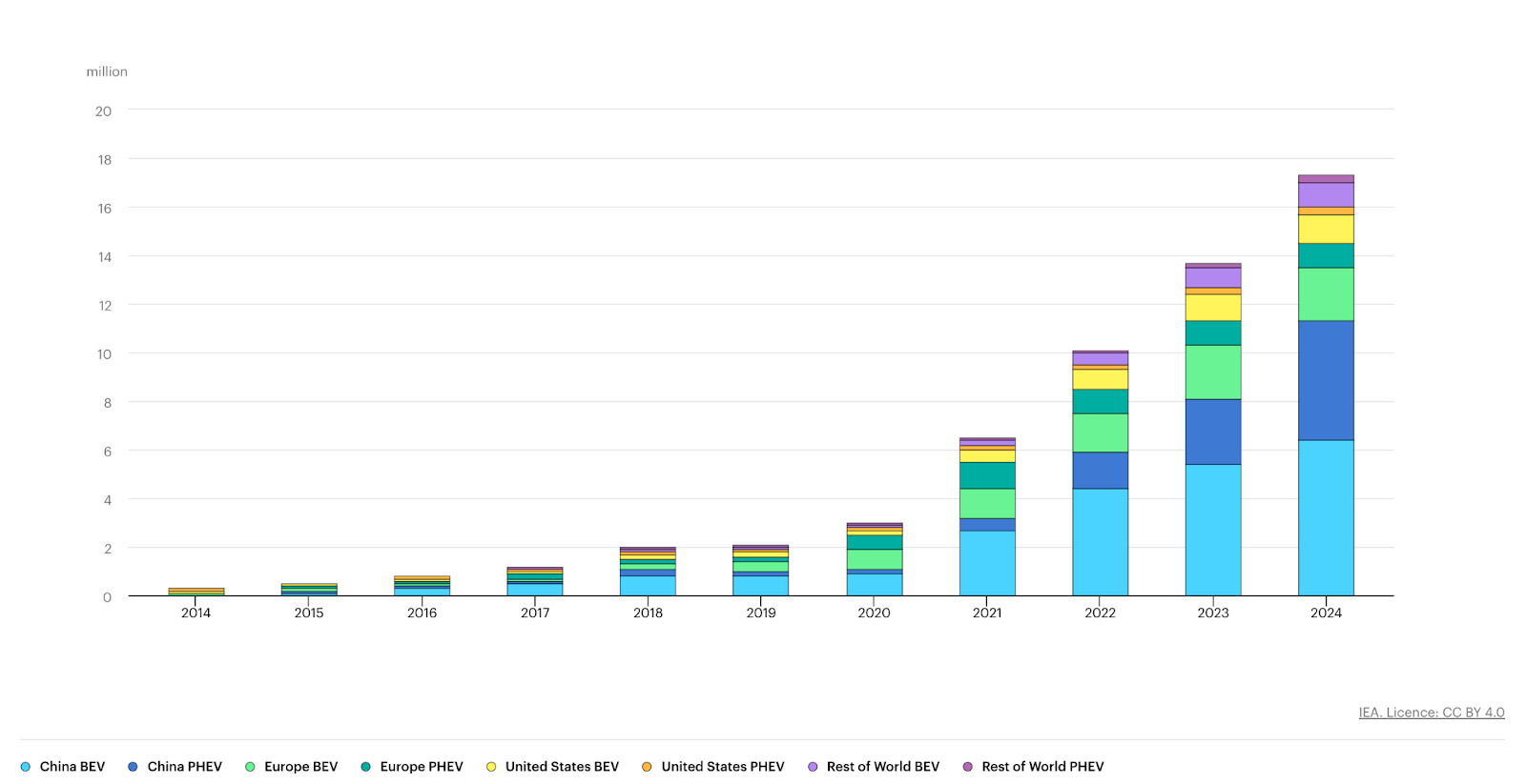 More than 17 million electric cars were sold worldwide in 2024, making up over 20 percent of all new vehicle sales, a sharp increase from the previous year, according to the International Energy Agency’s (IEA) Global EV Outlook 2025.
