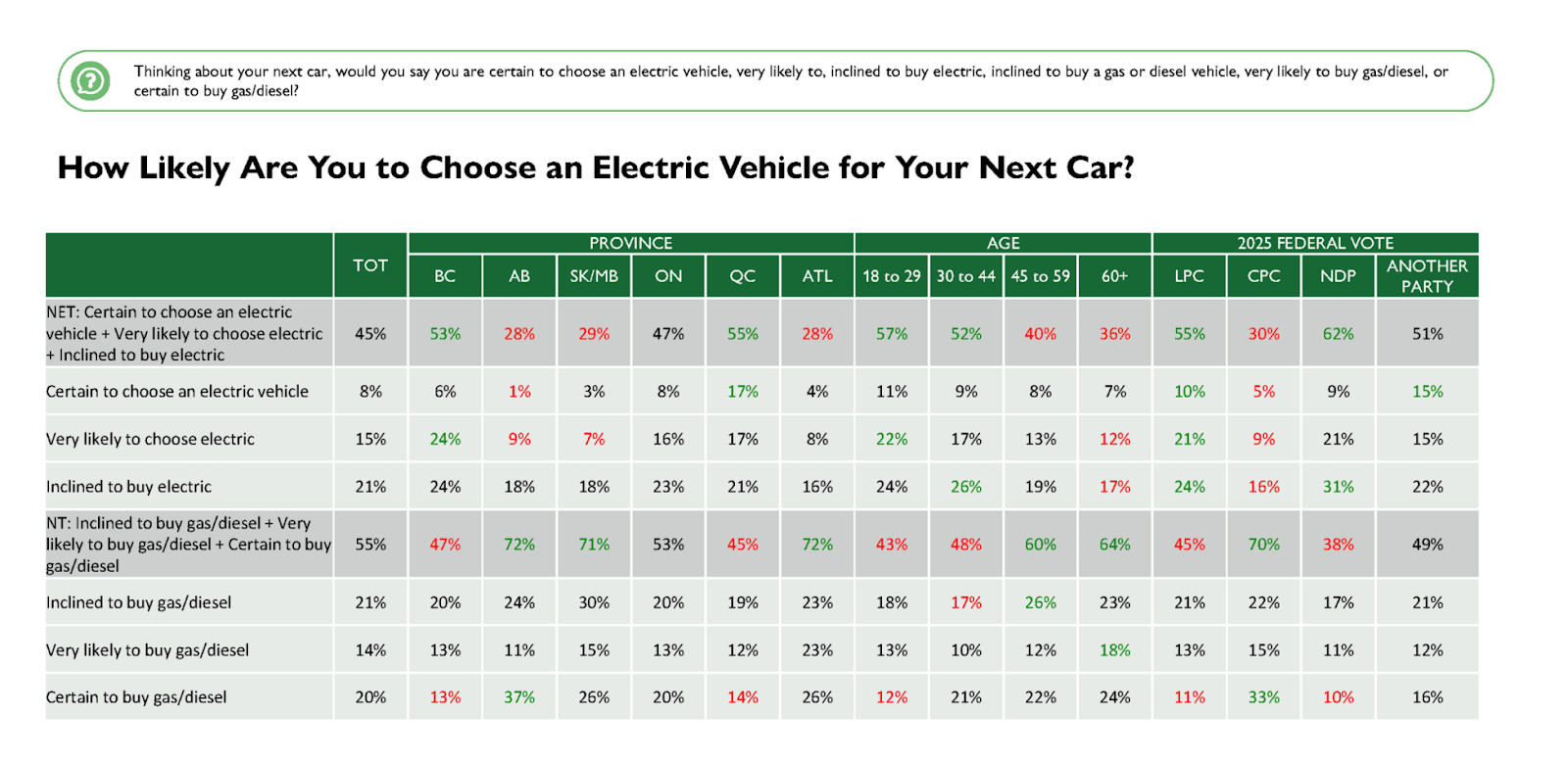 A recent Abacus Data survey conducted for Clean Energy Canada found that 45 percent of Canadians are certain, very likely, or inclined to choose an EV for their next vehicle. Support is especially strong in provinces like Quebec (55 percent) and B.C. (53 percent), as well as among younger Canadians aged 18 to 29 (57 percent) and 30 to 44 (52 percent).
