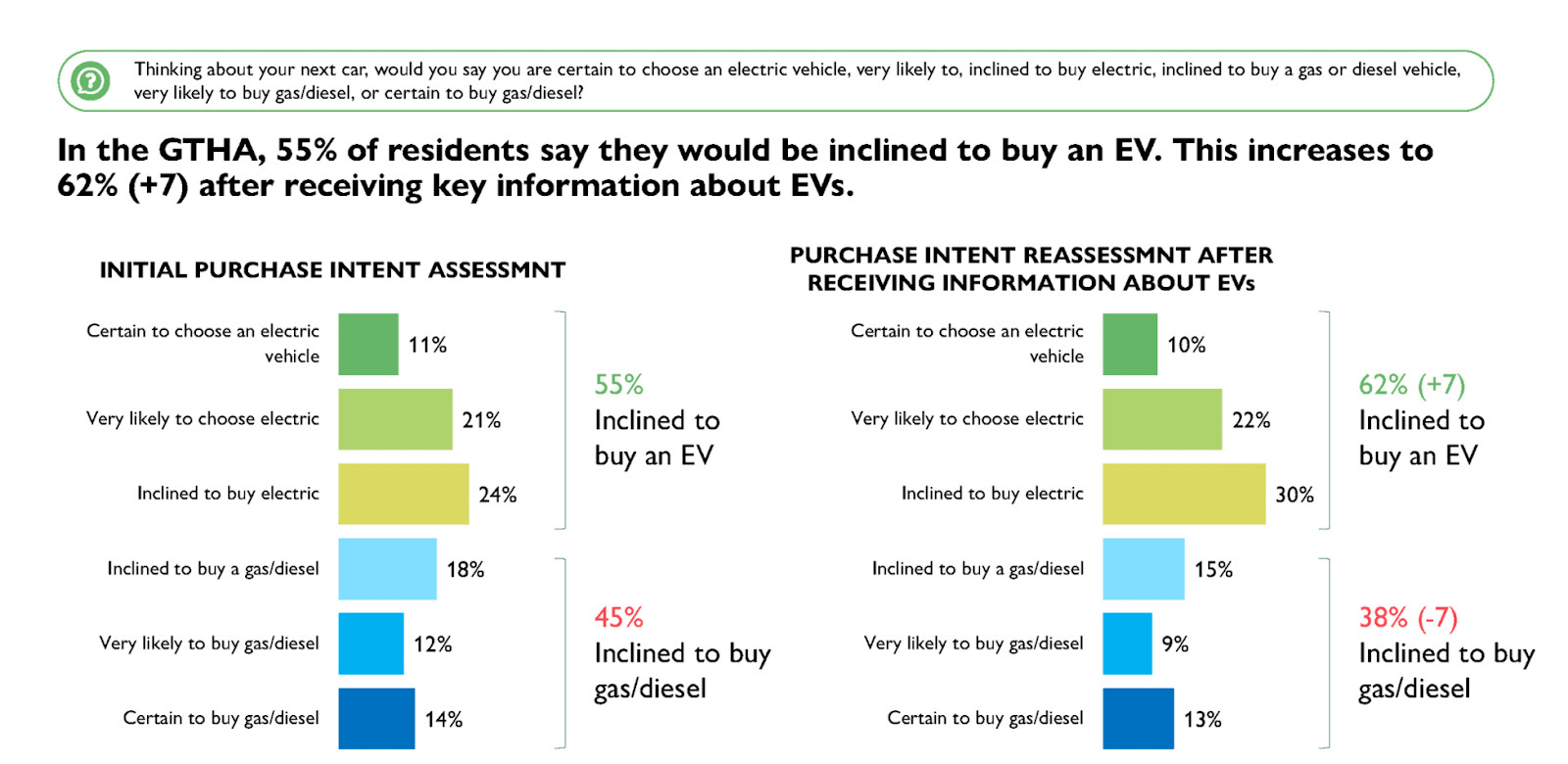In the GTHA, where actual EV uptake has lagged, 55 percent still said they preferred an EV over a gas-powered car, and that figure jumped to 62 percent when respondents were given more information about EVs, pointing to significant potential for growth with better public education and policy support.