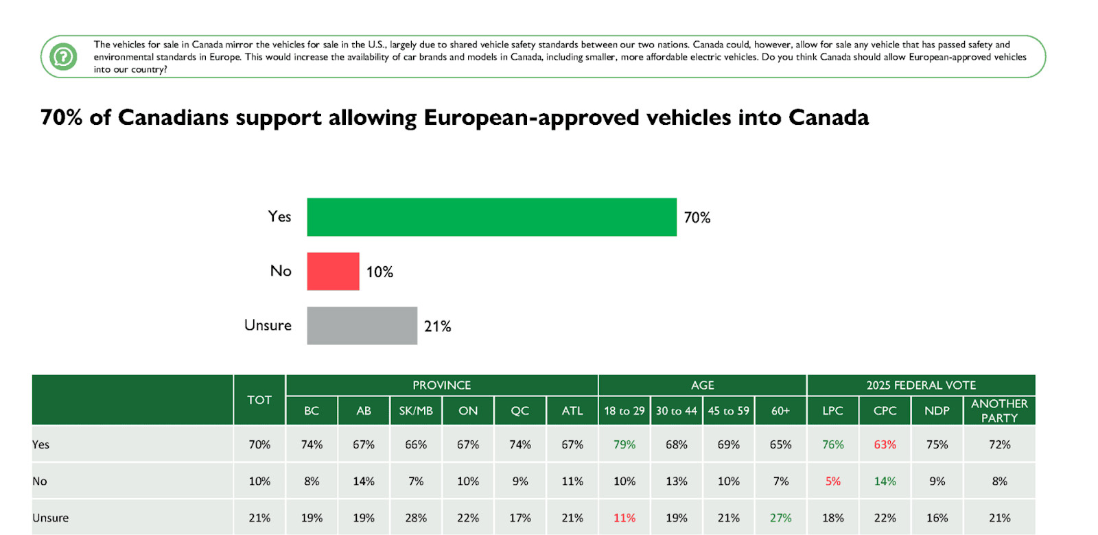 Clean Energy Canada’s director of policy and strategy, Joanna Kyriazis, and 70 percent of Canadians support allowing the sale of EVs approved by the EU’s safety standards in Canada. “Currently, Canada aligns with U.S. standards and misses out on many affordable models available in the EU. Recognizing EU standards would open the market to these vehicles, making EVs more accessible,” she noted.