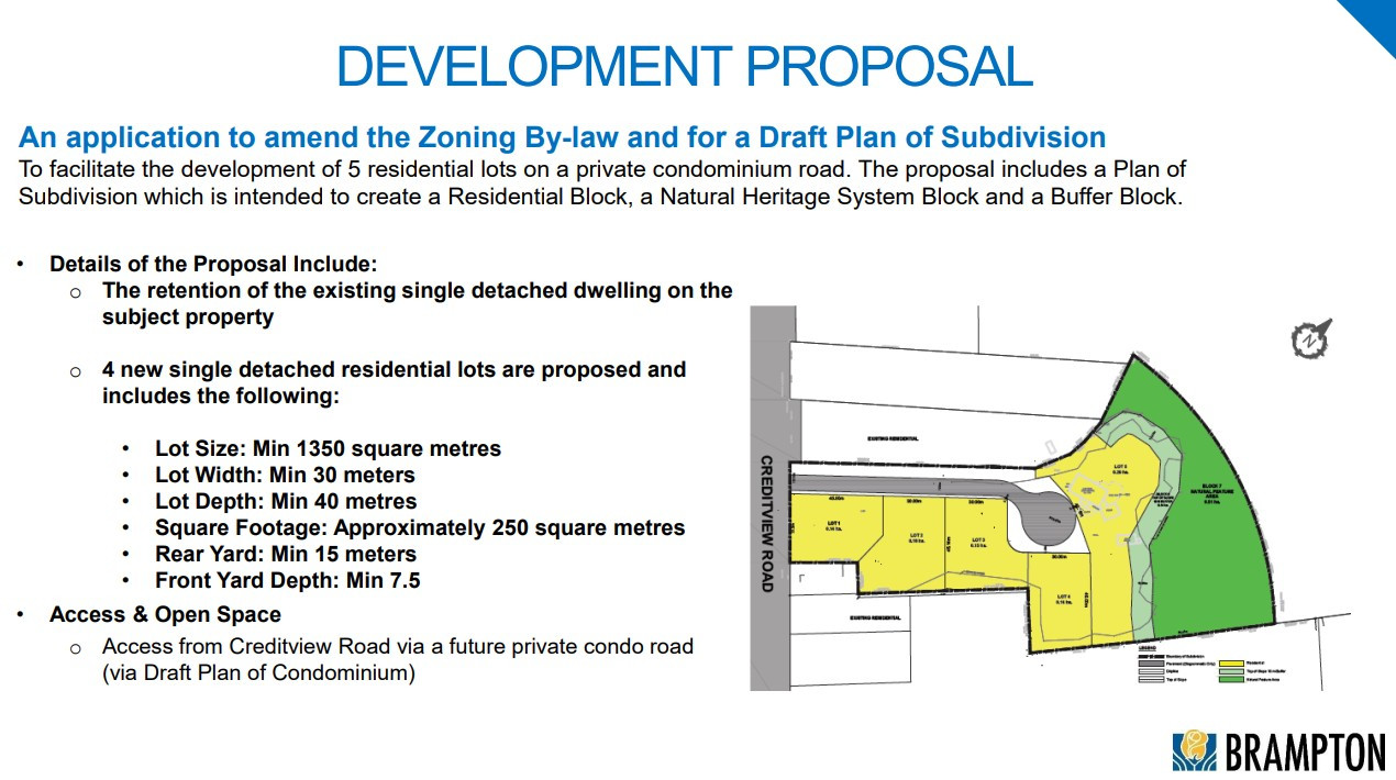 Proponents Amaninder Bharj and Rasneet Bharj want a zoning amendment to allow the construction of four new estate-style single-detached dwellings and one other housing feature on the existing property, which currently is a deep lot, surrounded by trees and one main building that sits back from Creditview Road.