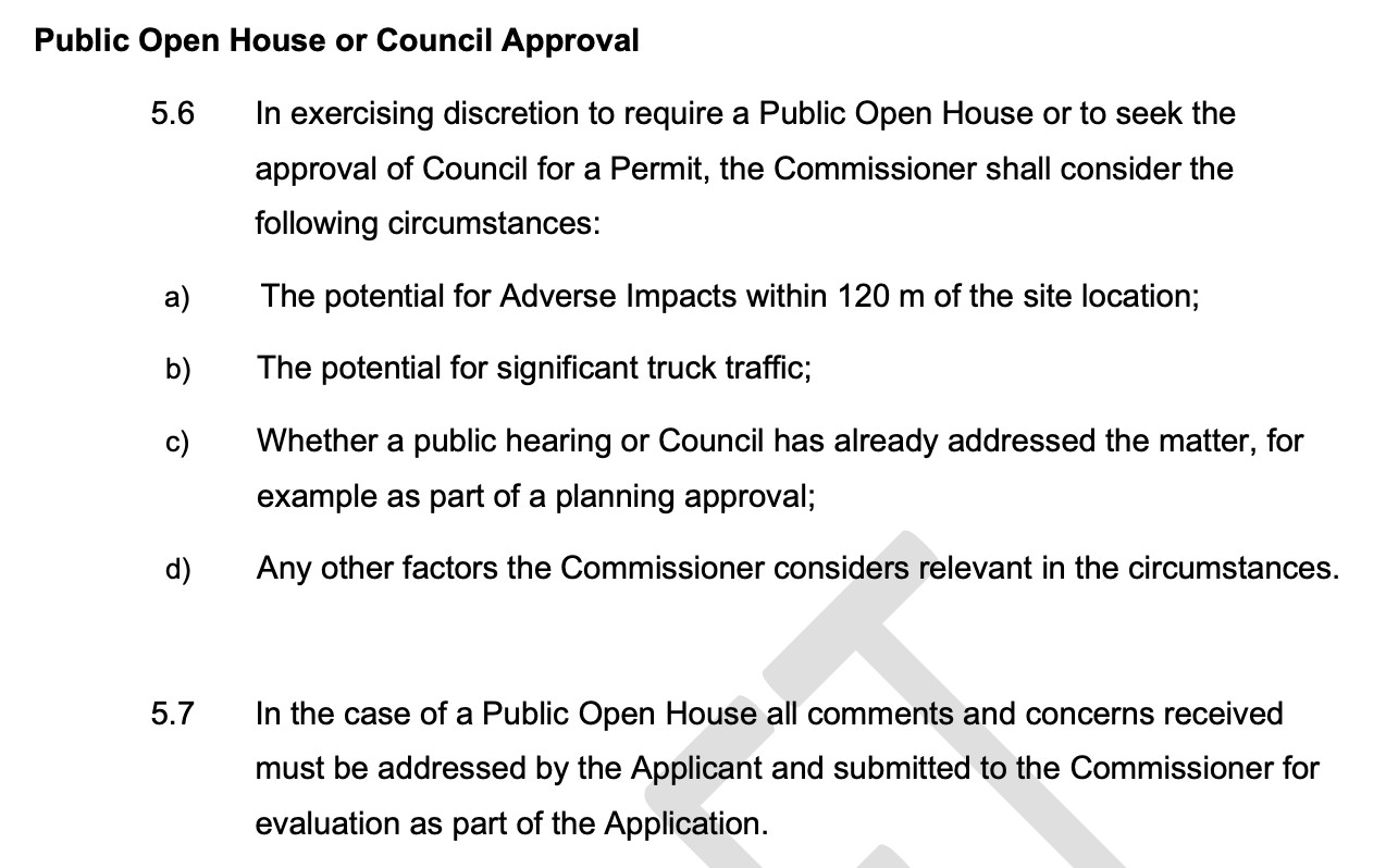 The Commissioner has sole discretion to decide whether a Public Open House or Council approval is needed for a permit, based on factors like potential impacts, truck traffic, or prior hearings. If a Public Open House is held, it is the applicant, not the Town, who must collect and address public concerns, which are then submitted back to the Commissioner for review.