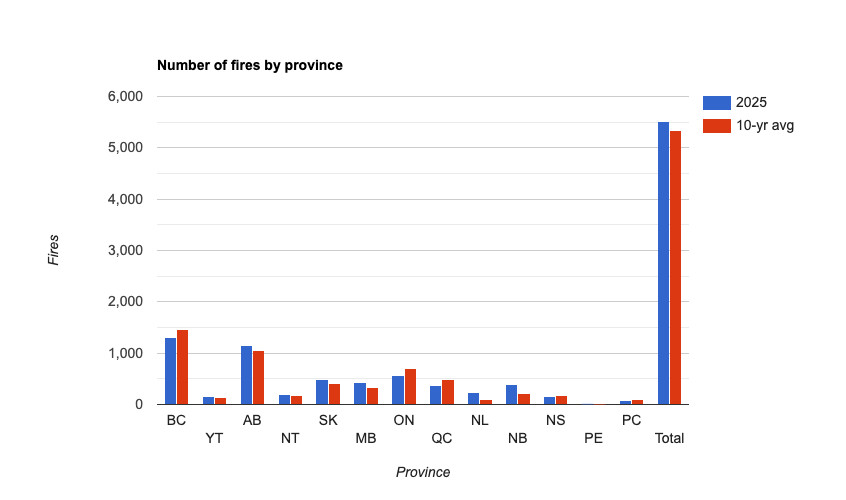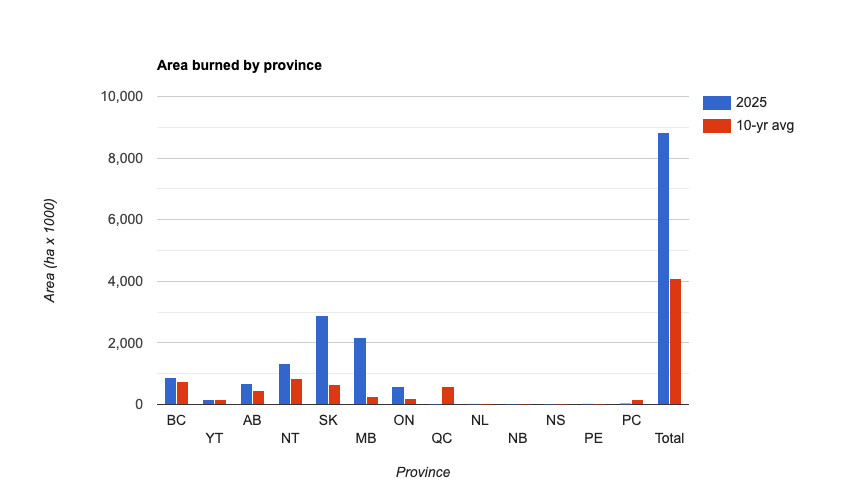 In 2025, wildfires have scorched more than 8.8 million hectares across the country, marking the second-worst wildfire season on record, just behind 2023. By mid-August, the area burned was roughly equivalent to the entire province of New Brunswick, with Saskatchewan alone accounting for over half of the total.
