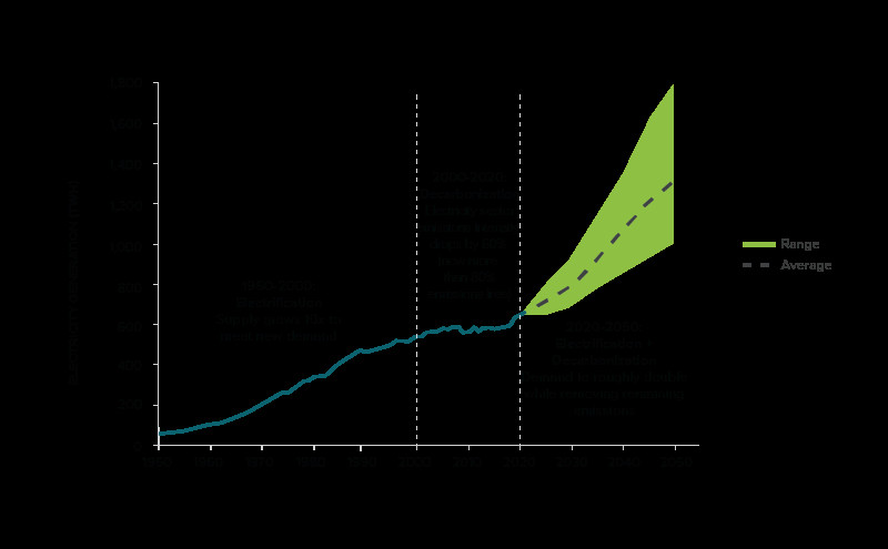 From 1950 to 2000, electrification drove a tenfold increase in electricity supply, from 2000 to 2020 decarbonization reduced emissions intensity by 60 percent with little generation growth, and from 2020 to 2050 electricity generation is projected to double, ranging from 1,000 Terawatt per hour (TWh) to 1,800 TWh.