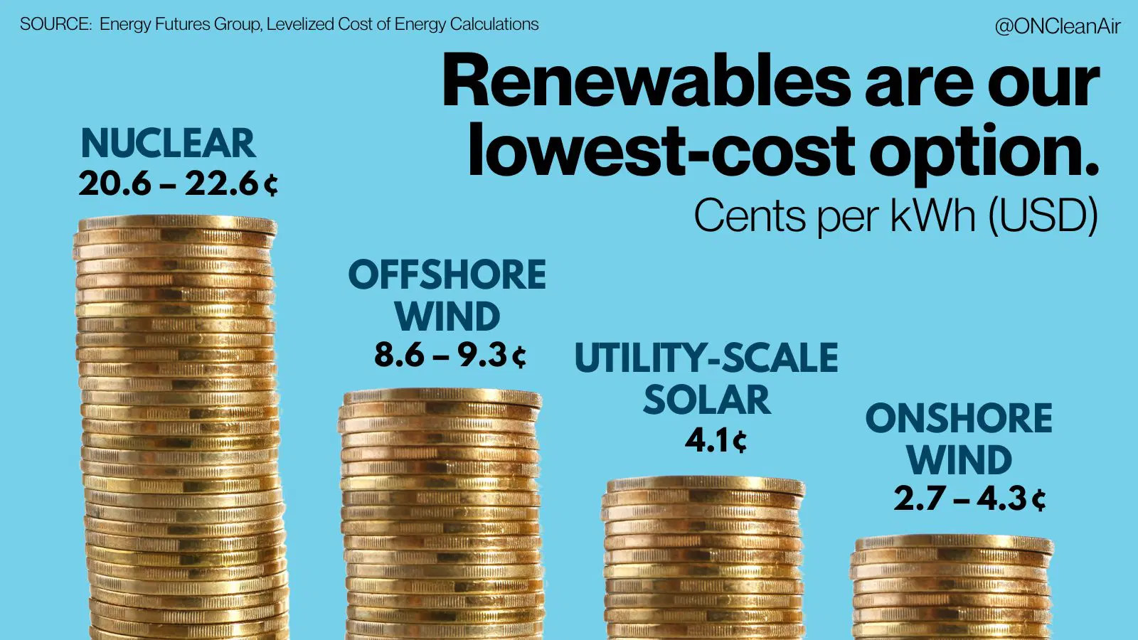 The Ontario Clean Air Alliance warns the new U.S. GE-Hitachi nuclear reactors are the highest-cost option to meet Ontario’s electricity needs – costing two to eight times more than new solar and wind power.
