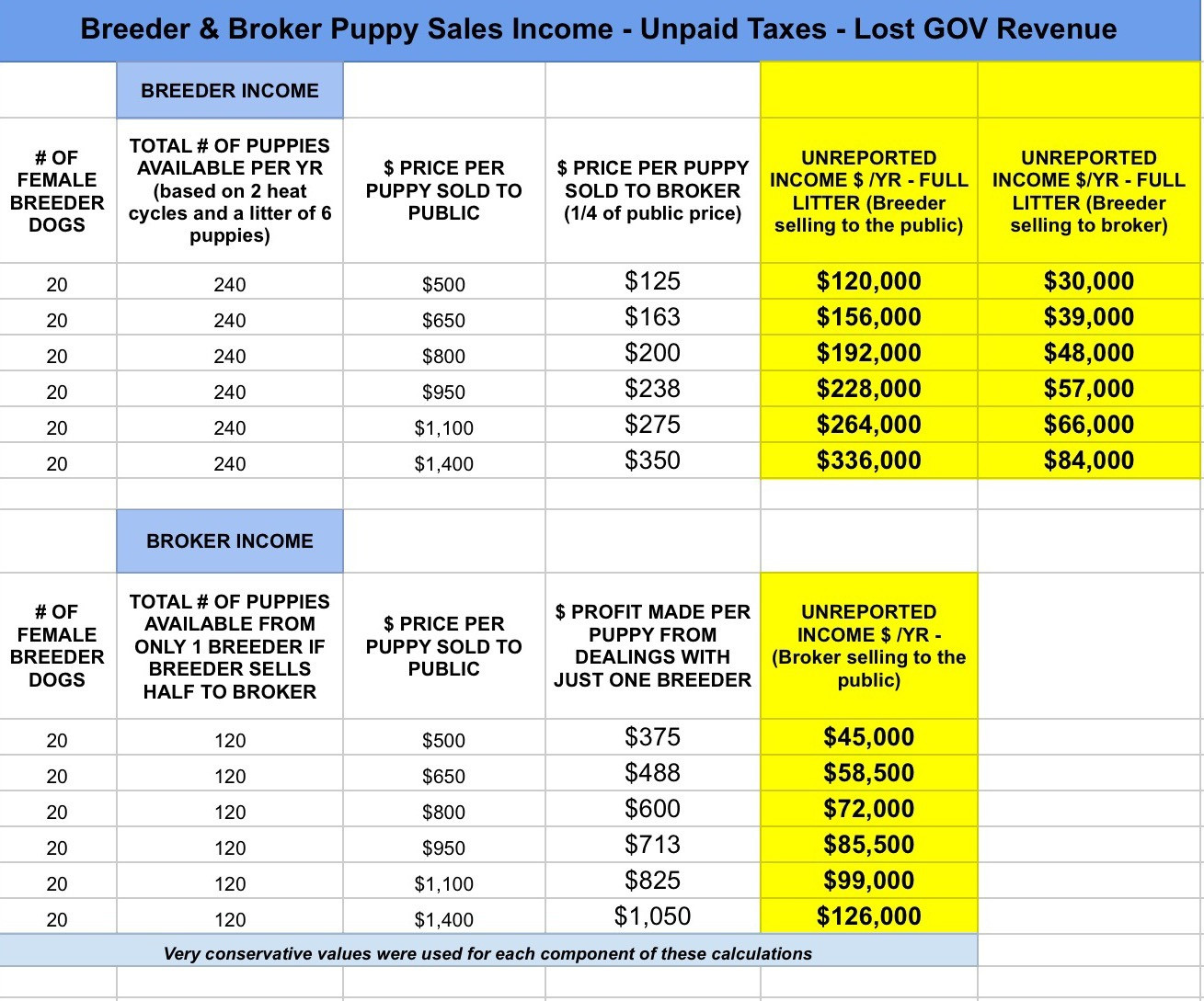 Conservative estimates of the income a commercial dog breeder (puppy miller) and a broker (middlemen who sell to the public or pet stores) could earn in a given year, depending on the number of dogs being exploited.