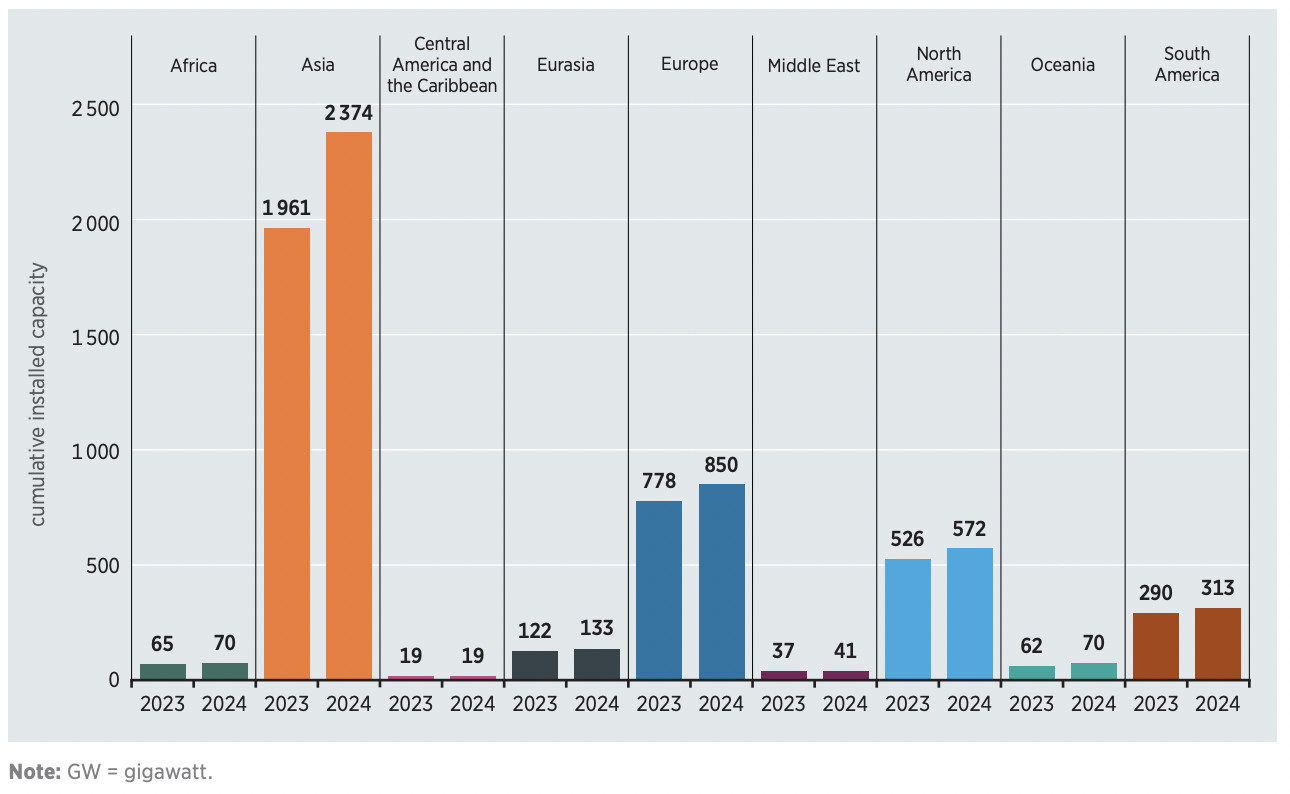 The global renewable energy sector reached an unprecedented milestone in 2024, adding 582 gigawatts (GW) of new capacity, a 19.8 percent increase over 2023 and the largest annual expansion on record. Solar photovoltaic (PV) led this growth, contributing 452.1 GW, or 77.8 percent of the total, followed by wind with 114.3 GW (19.6 percent) and hydropower at 9.3 GW (1.6 percent), alongside smaller contributions from bioenergy, geothermal, and marine sources. These additions brought total global renewable energy capacity to 4,443 GW. Asia was the main driver, adding 413.2 GW, a 21.1 percent increase from the previous year, bringing the region’s cumulative capacity to 2,374 GW. Within this expansion, China accounted for 61.2 percent of new solar PV and 69.4 percent of new wind capacity. Other countries, including the United States, India, Brazil, and Germany, also saw significant growth, reflecting a strong and accelerating global momentum toward renewable energy deployment.