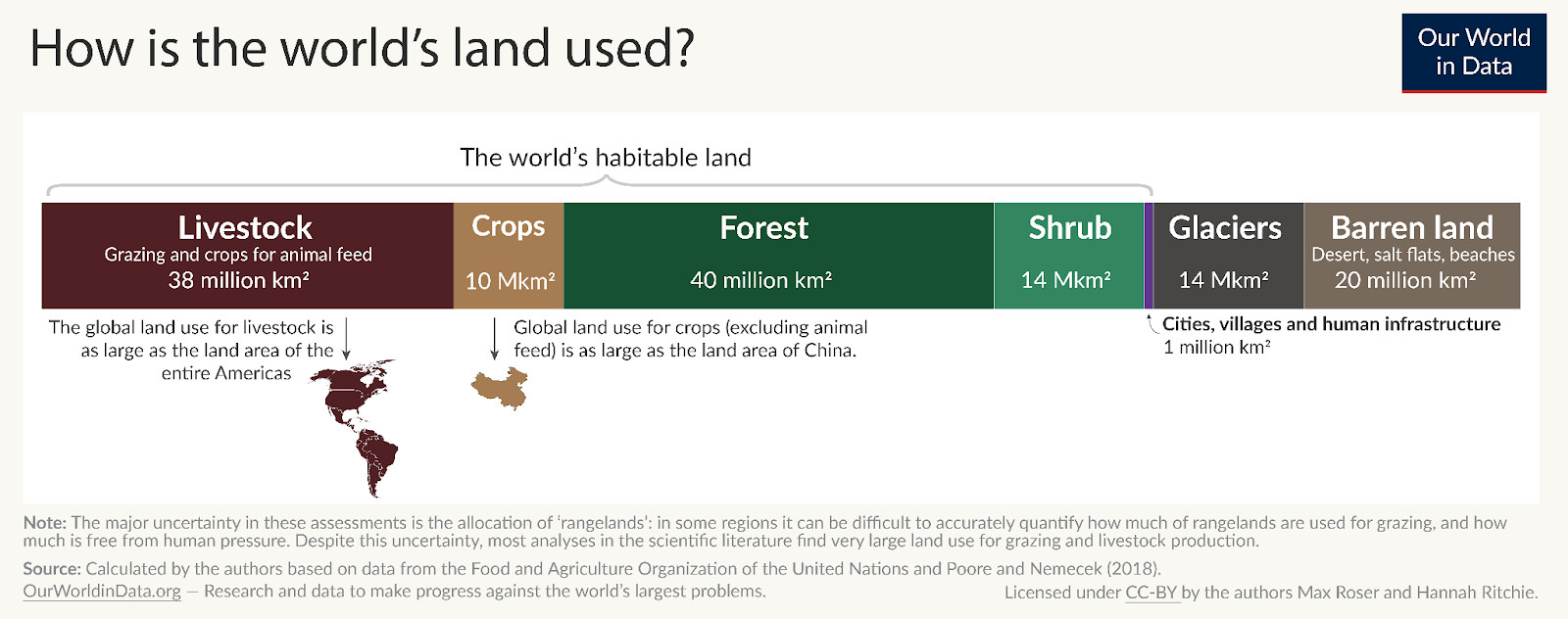 Human activity has left its clearest mark on the planet through the conversion of wild habitats into farmland. Just a thousand years ago, less than four percent of habitable land was used for agriculture, but today nearly half, about 48 million square kilometres, is devoted to farming. Croplands make up one-third of this, while grazing land for livestock occupies the remaining two-thirds. When combining grazing land with cropland used to grow animal feed, livestock alone accounts for 80 percent of agricultural land use. Yet despite this vast footprint, animal products supply only 17 percent of global calories and 38 percent of protein.