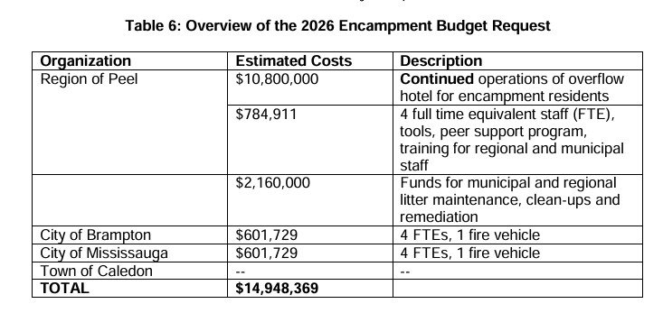 A breakdown of the funds needed to support the new Region of Peel encampment protocols next year.