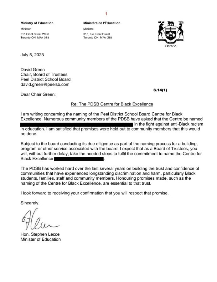 Former education minister Stephen Lecce’s letter to Chair of the Peel District School Board David Green ordering the board to fulfill its promise to the community and name the Centre for Black Excellence after Kola Iluyomade.