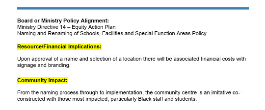 Trustees who had opposed Iluyomade’s advocacy, and had allowed him to be targeted in a board threat to ban him from entering PDSB properties, ignored the report and stripped Iluyomade’s name from the centre. They cited an updated policy—approved by themselves a few weeks earlier—that prevented them from naming the centre after "identifiable individuals”.