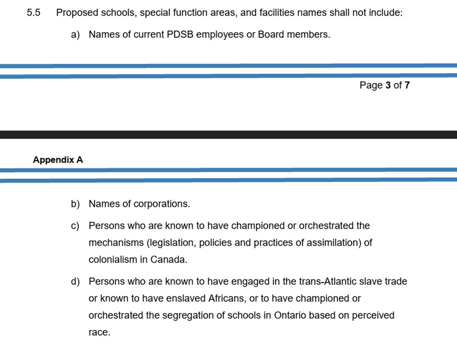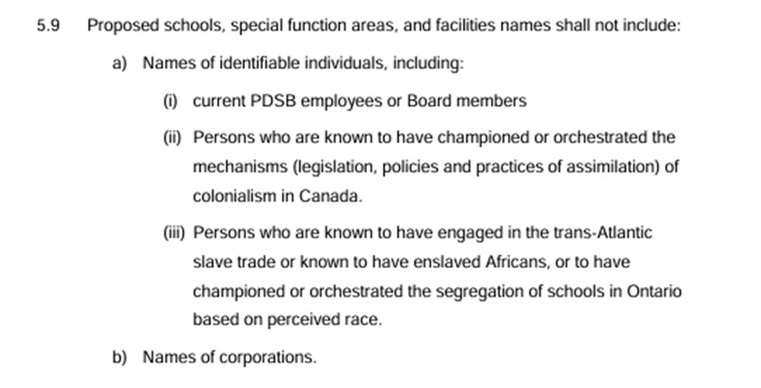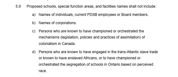 The final version of the policy as approved on April 26, 2023 by the PDSB trustees and the wording stipulating schools and other facilities should not be named after “identifiable individuals”.