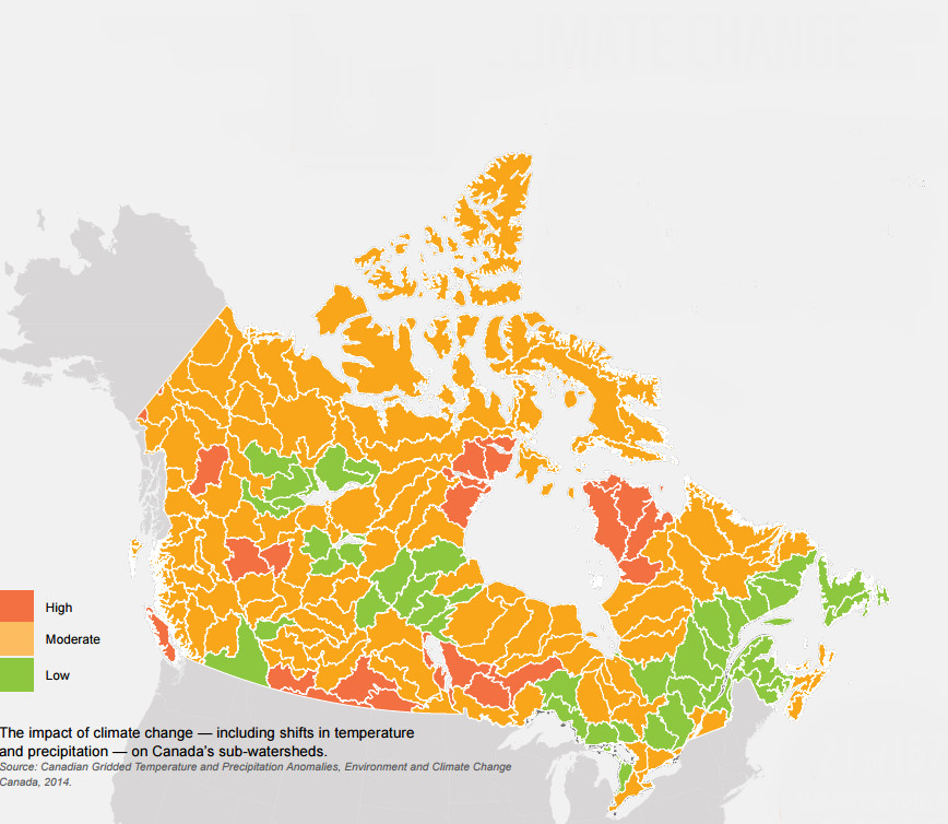 With 20 percent of the world’s freshwater, Canada has immense responsibility for safeguarding its lakes, rivers, streams and wetlands, but the country’s water systems are in crisis. The World Wildlife Fund (WWF) warns that all 167 Canadian sub-watersheds are under threat, with nearly three-quarters showing moderate to high impacts from climate change. In a 2017 report, WWF Canada found that all but 41 sub-watersheds out of 167 have seen moderate or high impacts from climate change. “Even small shifts in temperature and the precipitation that replenishes rivers can have a large impact on ecosystem dynamics, including change in water levels and rate of flow,” the report stated. It noted 53 sub-watersheds were found to have “high or very high levels of disturbance,” with southern watersheds facing greater stress due to higher road densities and the concentration of Canada’s agriculture and industry in the region.