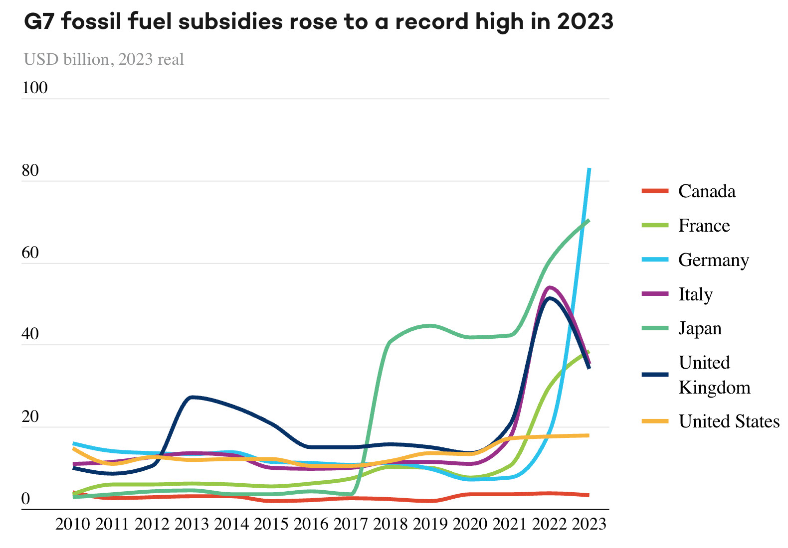 Fossil fuel subsidies among G7 nations reached a record US$282 billion in 2023, up 297 percent from US$71 billion in 2016. In 2023, Germany had the highest fossil fuel subsidies among G7 members (USD 83 billion), followed by Japan (USD 70 billion), France (USD 38 billion), Italy (USD 35 billion), the United Kingdom (USD 34 billion), the United States (USD 17.8 billion), and Canada (USD 3.4 billion).