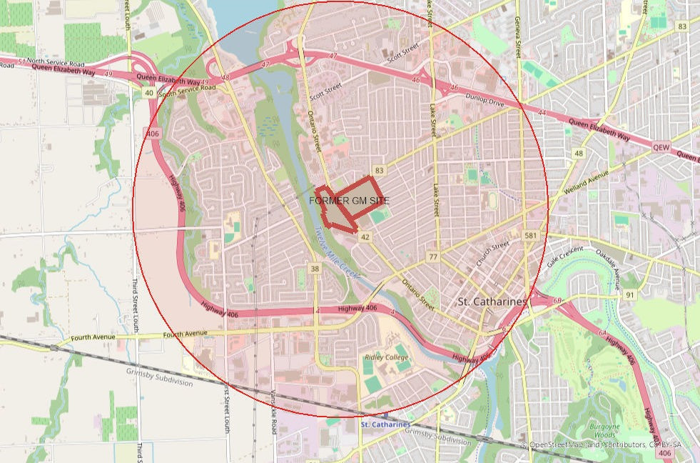 Studies have shown that the health impacts of a brownfield site can extend 2,000 metres beyond the property line. The map above shows a 2,000 metre buffer around the contaminated former GM site in St. Catharines.