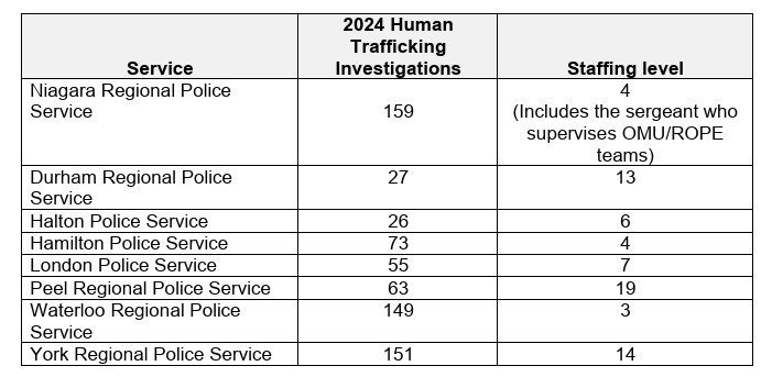 Of the other large police services in Ontario, Niagara had the highest number of human trafficking investigations—doing so with one of the smallest investigative complements.