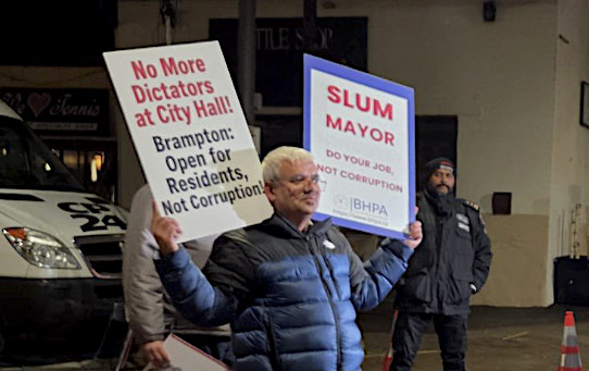 Holding placards that read: “Fire David Barrick”; and “WAKE UP MAYOR BROWN STAND FOR THE TRUTH STOP MISUSING TAXPAYERS’ MONEY,” residents were calling for the removal of Barrick, after he was hired directly by Brown, who chaired the committee that recommended him, and defended his numerous controversies before his arrival in Brampton—Brown made misleading claims about Barrick’s involvement in the Niagara scandal exposed by the Ontario Ombudsman.