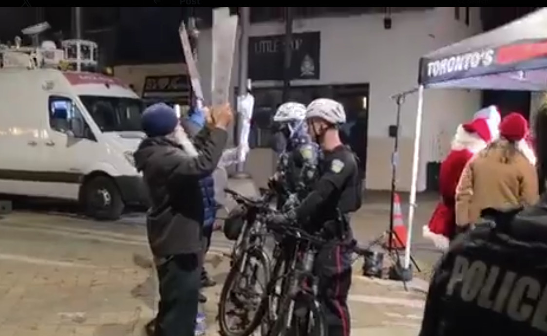 The protest occurred during a live broadcast of CP24’s holiday interview with Santa Claus. Goyat, along with three others, stood behind the broadcast holding signs protesting Brown’s leadership and urging residents to “fight for your rights”. Goyat said the group was not interrupting the broadcast.