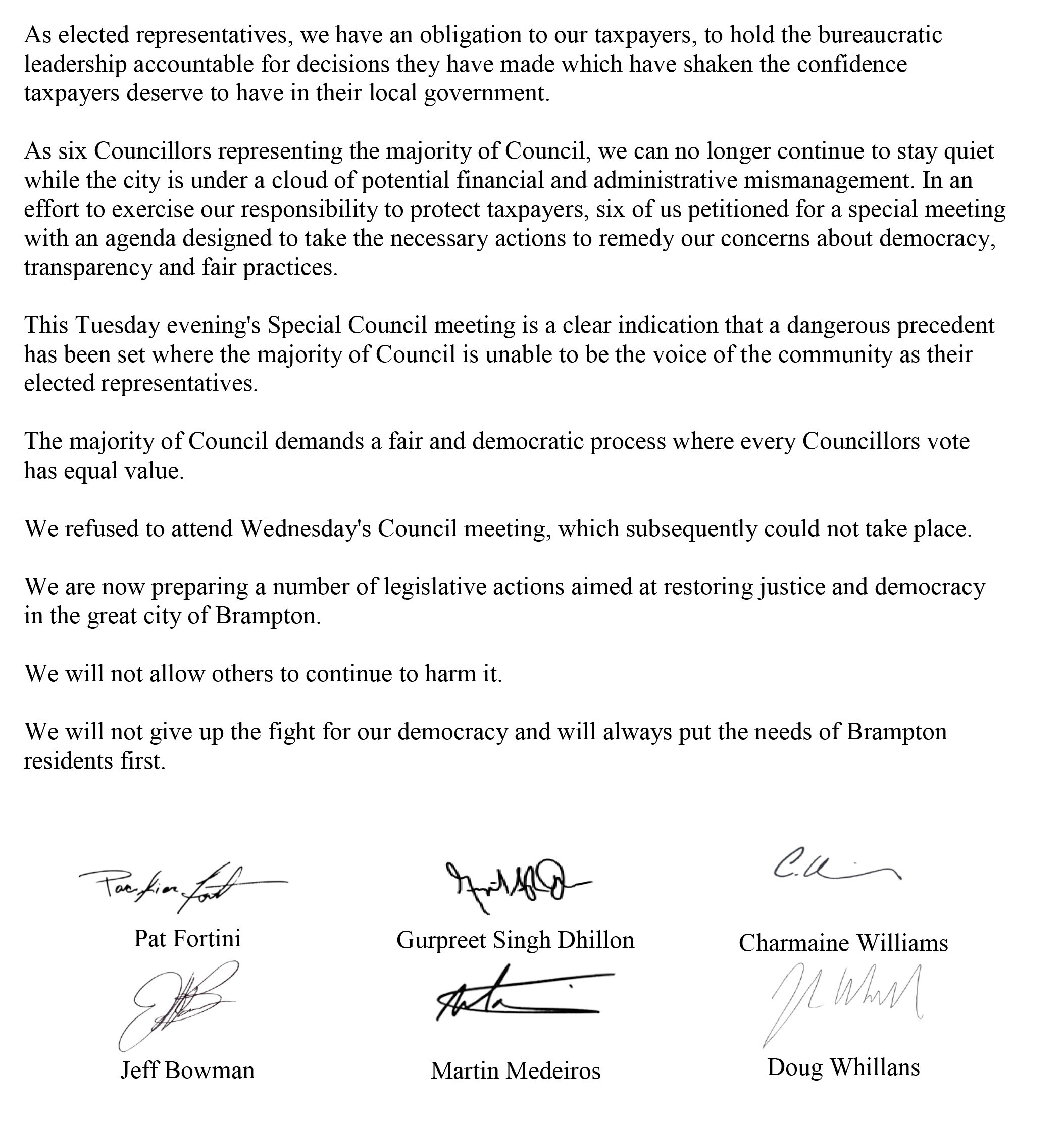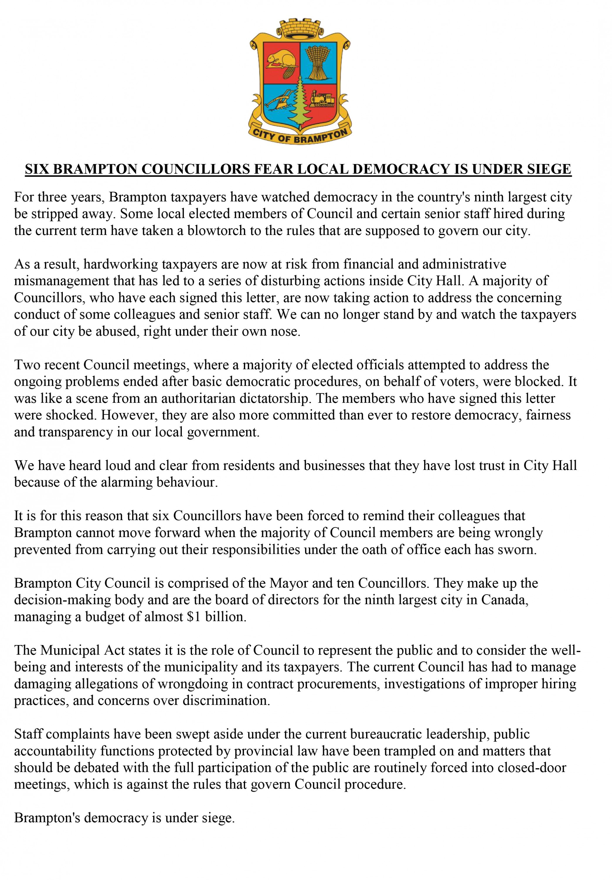 Since Brown was sworn in as mayor, there have been ongoing governance issues, and a lack of transparency and accountability, culminating last term when a majority of Brampton Council members—Jeff Bowman, Martin Medeiros, Charmaine Williams, Gurpreet Dhillon, Doug Whillans and Pat Fortini—described Brown as an “authoritarian” leader. They warned that democracy in Brampton was “under siege” due to Brown’s alarming leadership.