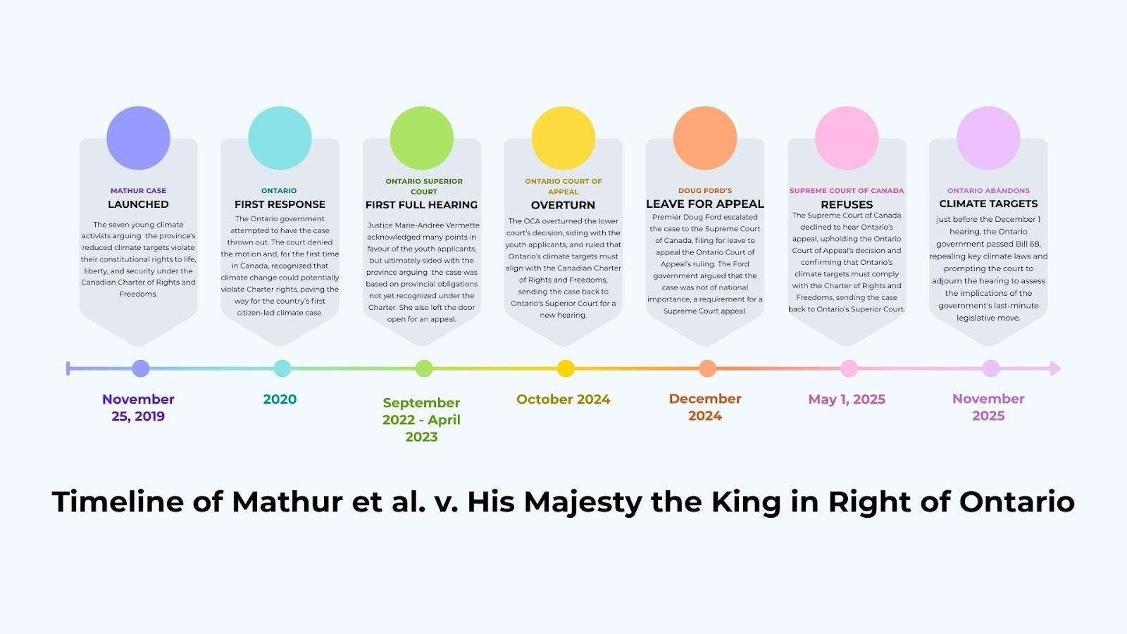 In November 2019, seven young activists, led by Sophia Mathur and Madison Van Dyck, challenged Ontario's reduced climate targets, claiming they violated their Charter rights to life, liberty, and security. In 2020, the Ontario government tried to have the case dismissed, but the court ruled that climate change could violate Charter rights, allowing the case to proceed. The hearing in September 2022 saw Justice Marie-Andrée Vermette side with the government, though she criticized Ontario's emissions plan. In October 2024, the Ontario Court of Appeal reversed the decision, ruling that Ontario’s climate targets must comply with the Charter, sending the case back to the Superior Court. In December 2024, Ontario Premier Doug Ford appealed to the Supreme Court, but on May 1, 2025, the Supreme Court declined to hear the case, upholding the Appeal Court's decision. On November 25, the Ford government abandoned its requirements to have emissions targets, a climate plan and report progress to the public; the following day, Ecojustice announced the Mathurs case had been adjourned.