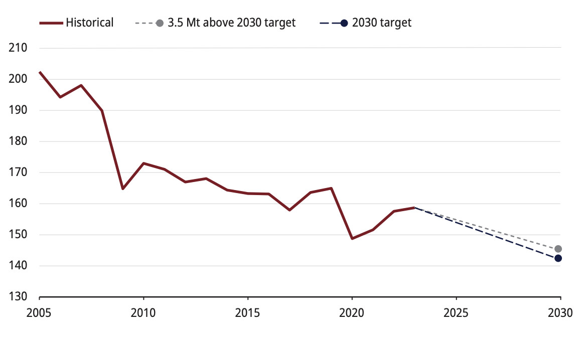 Well, it doesn’t. A January 2025 projection from the Ministry of the Environment, Conservation and Parks shows the province will fall short by over 3.5 megatonnes.