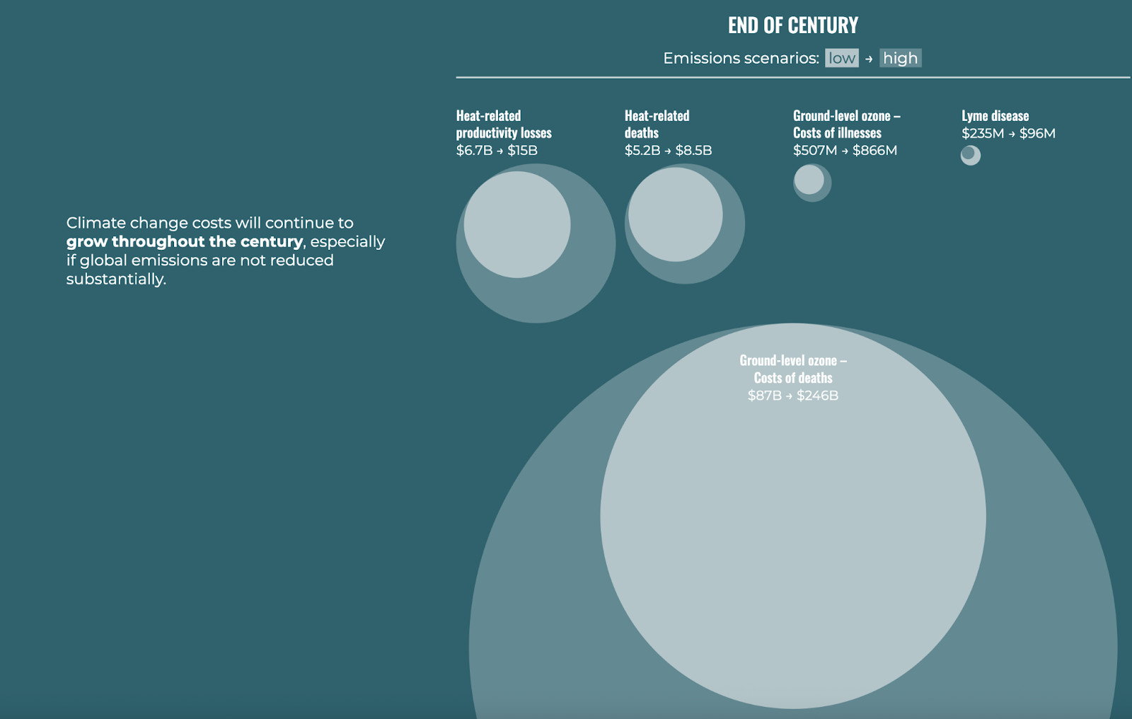 A 2021 Canadian Climate Institute report noted climate change could cost Canada billions in health-related impacts, projecting that heat-related deaths and illnesses may cost between $3.0 billion and $3.9 billion annually by mid-century with additional expenses including potential healthcare costs from ground-level ozone at around $1 billion per year, and premature deaths linked to ozone exposure exceeding $300 billion annually by 2080 under a high-emissions scenario. “I think it's evident that climate policy has costs, but so does climate change, and just because I cannot give you the exact amount of money that climate change will cost, that doesn't mean it will not get worse,” Sophia Mathur said at the Environment and Sustainable Development Committee on October 30.