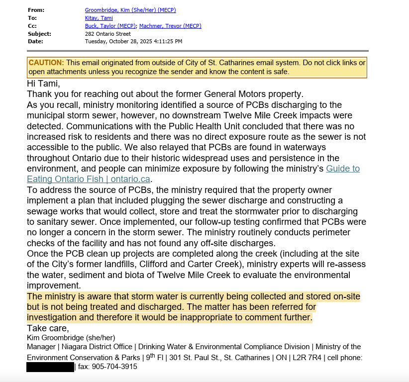 Kim Groombridge, the ministry staffer who wrote the October 28 email to Tami Kitay, informing the City of St. Catharines that the filtration system is not operational, repeated language the ministry has used for more than three years, reassuring officials and the public that “PCBs were no longer a concern in the storm sewer”.