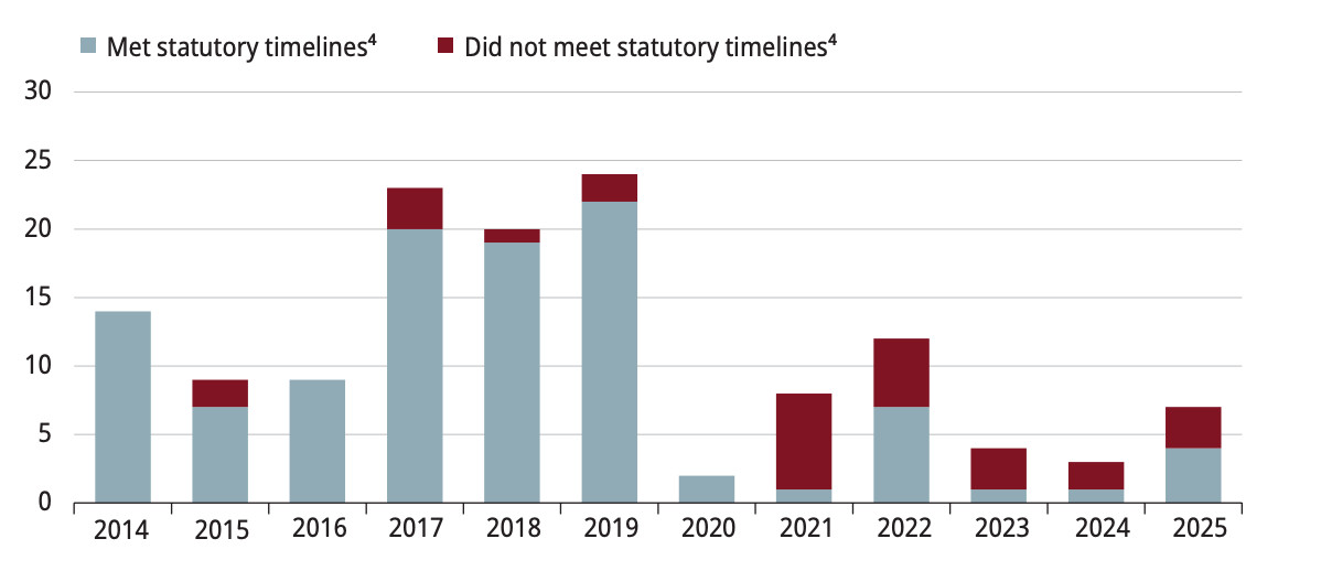 The Auditor General’s latest report revealed that both the environment and natural resources ministries repeatedly failed to meet the legally mandated timelines for handling applications submitted under the Environmental Bill of Rights since 2019, even as the number of applications has fallen, despite having no discretion to extend the deadlines except when formally prolonging an investigation. Of the 12 applications for review or with active investigation, or completed in 2024-25, the ministries missed statutory timelines in half of the cases.