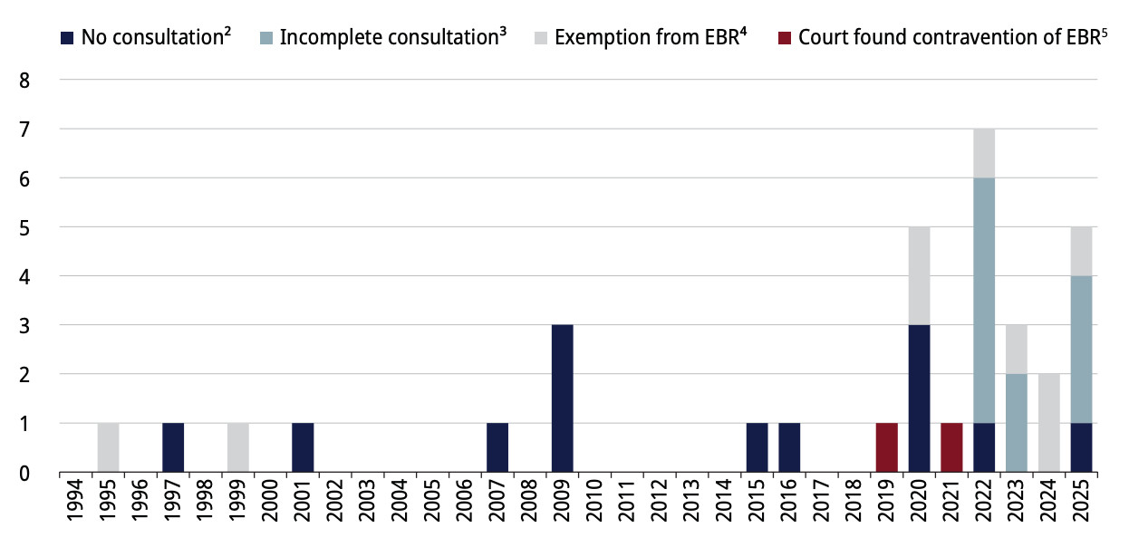 Since 2019, the province has increasingly bypassed the Environmental Bill of Rights, passing environmentally significant bills without consultation, approving projects before consultations ended, granting broad exemptions, and even being twice found by the Divisional Court to have violated the Act including in 2019 when the Court ruled Ontario broke the law by failing to consult the public on Planning Act changes that enabled rapid rezoning for fast-tracked development. The trend has only worsened, with 2025 marking the second-highest year on record for incomplete consultations after 2022.