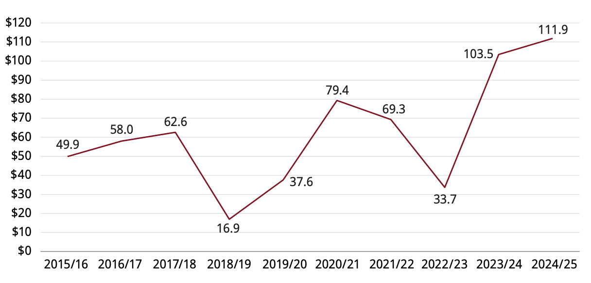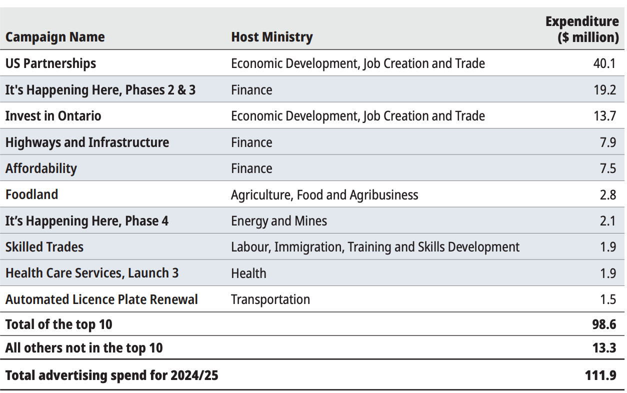 In 2024-25, the Ontario government set a new record for advertising spending, shelling out approximately $112 million, $8.4 million more than the previous year, according to the Auditor General’s annual review of government advertising since the 2005 implementation of the Government Advertising Act.
