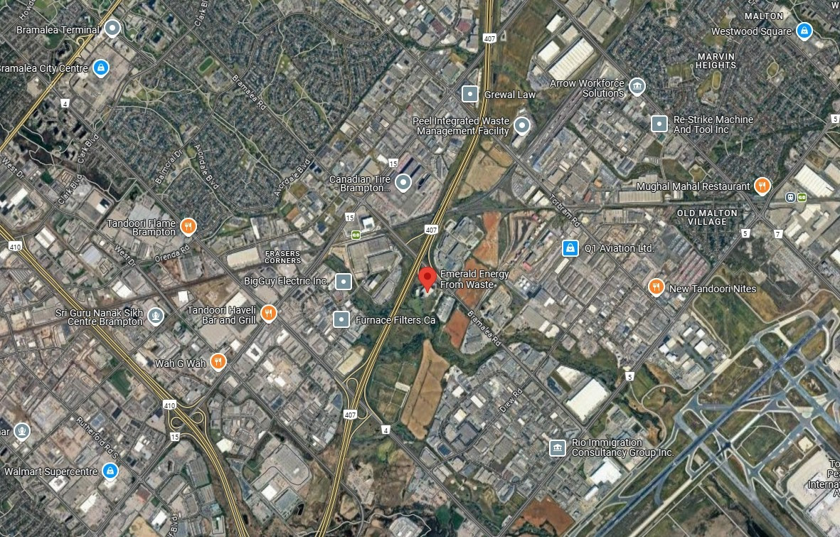 The Emerald Incinerator, marked by the red pin, is located beside Highway 407 and sits in close proximity to commercial businesses, health centres, and residential subdivisions.