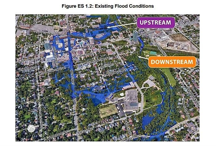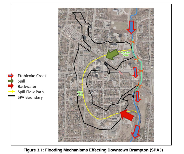 Based on its low elevation compared to Etobicoke Creek, downtown Brampton faces risk of flooding both upstream and downstream of the river.