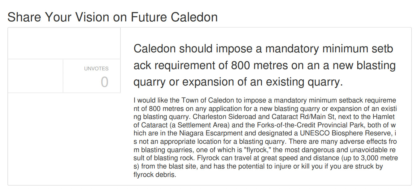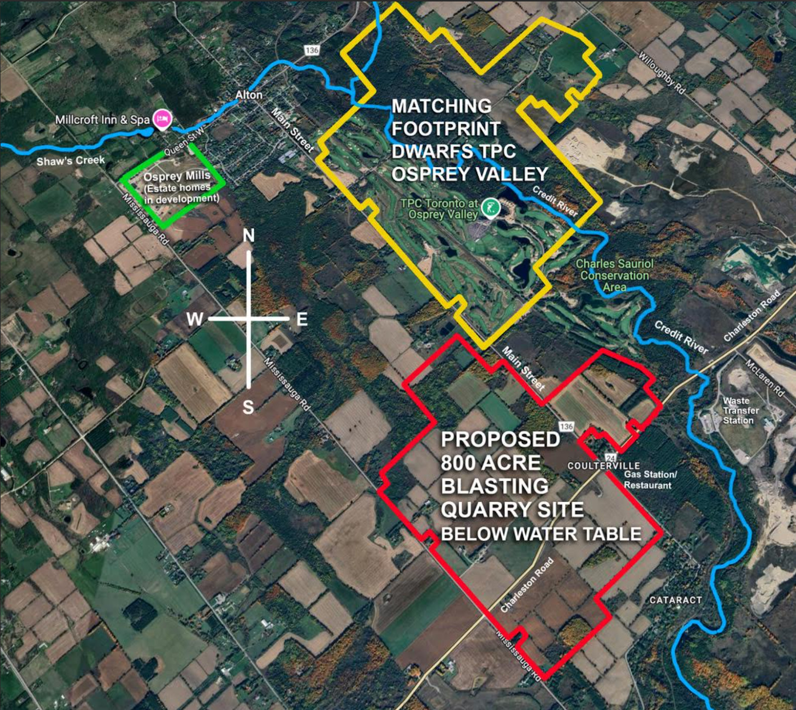 “[It] will transform our tranquil area, disturb the natural wildlife habitat, threaten our water supply, fill our clean, healthy air with dust, eliminate valuable farmland — thus slowly eroding local food security, and set a new blasting quarry precedent in Caledon with the jarring noise of blasting rock.”