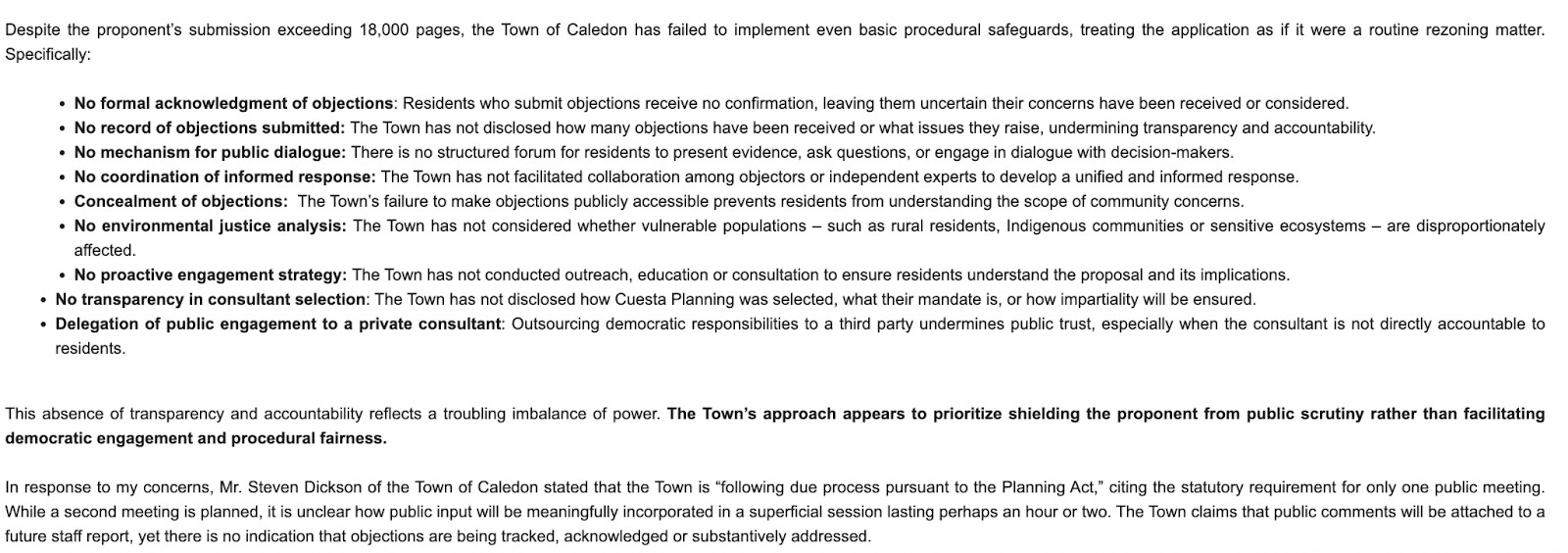 On July 25, Tony Sevelka filed a formal complaint, requesting the Ontario Ombudsman’s Office investigate the Town of Caledon’s handling of Votorantim Cimentos’ quarry application, citing serious concerns over procedural fairness and abuse of power. He argues that the Town’s failure to acknowledge or track objections, prevent public dialogue, and outsource public engagement to a private consultant undermines transparency and accountability. Sevelka calls for corrective action to ensure a fair process, highlighting the need for transparency, public participation, and environmental justice in such a significant development.