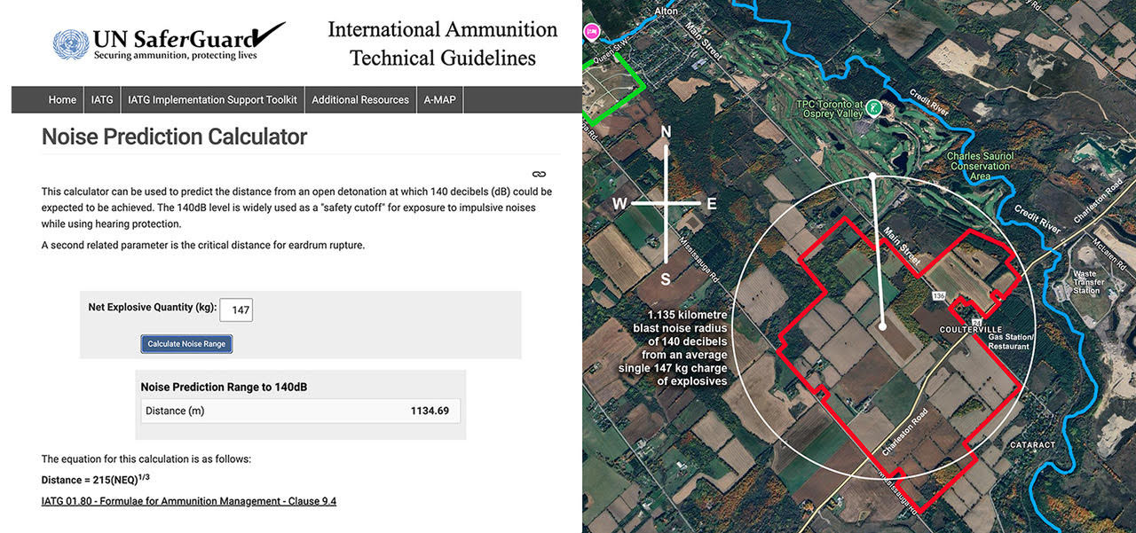 A single blast using 147 kilograms of explosives can generate noise reaching 140 decibels from more than 1.1 kilometres away, according to a United Nations’ Noise Prediction Calculator. The proposed blasting quarry in Caledon would use explosives on a far greater scale, Alton-resident Nestor Golets observed.