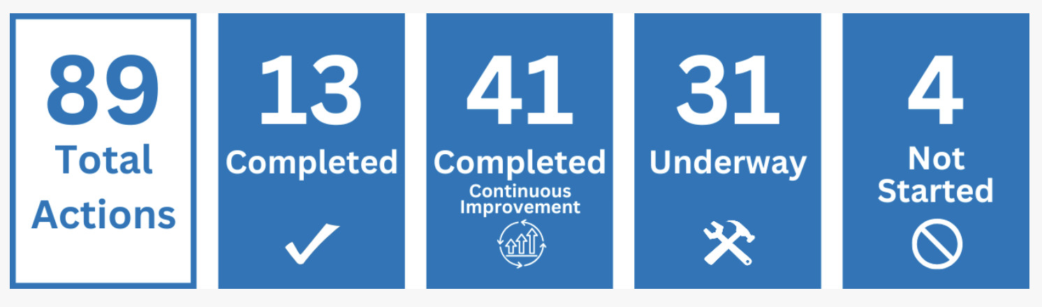 As of Winter 2024, 54 actions have been completed, including 41 continuous improvement actions, under Mississauga’s Climate Change Action Plan, with 31 actions underway.