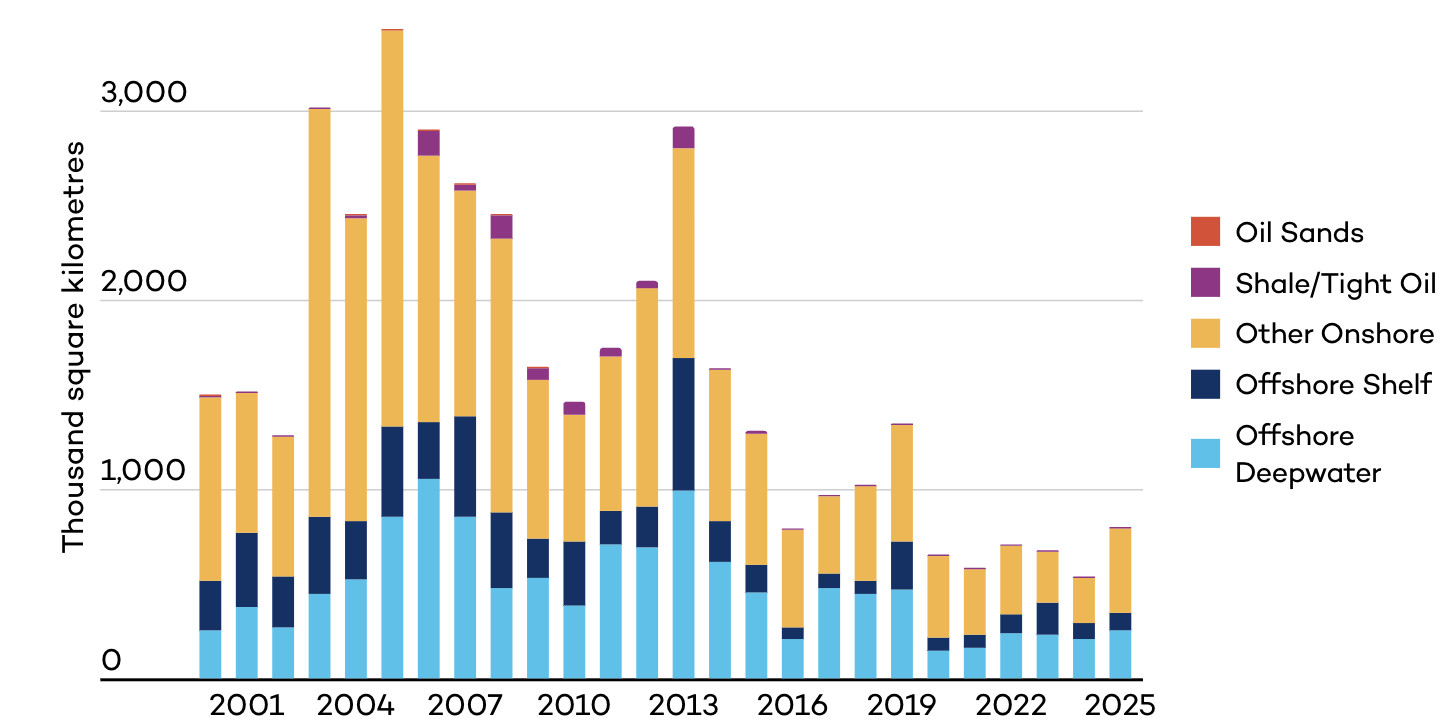 In 2025, oil and gas companies were awarded an area the size of Türkiye to explore, the largest acreage granted since the COVID-19 pandemic.