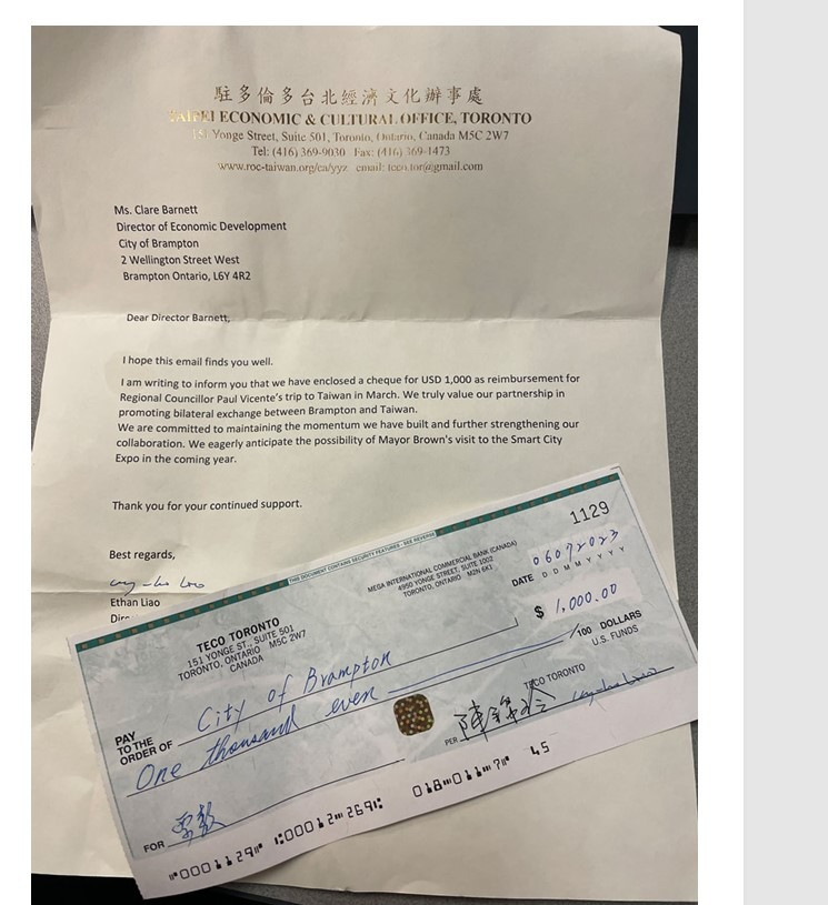 A letter written by the Taipei Economic and Cultural Office to the City of Brampton, describes a “bilateral exchange between Brampton and Taiwan,” with no explanation, and a cheque for $1,000 (US) attached as reimbursement for part of Vicente’s travel.