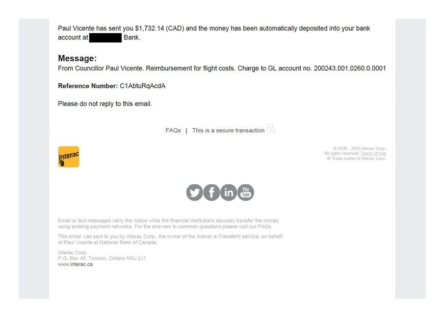 Councillor Vicente made an unusual reimbursement of $1,732.14 via Interac transfer for flight costs to a bank whose name has been redacted in an invoice document. If the money was reimbursed by Vicente, or another party, it’s unclear why this was done or what date the transaction was completed.