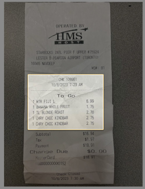 - October 1, 2023, $15.17 for a medium latte and cranberry muffin at Dulles International Airport in Washington, D.C. ($11.16 USD)