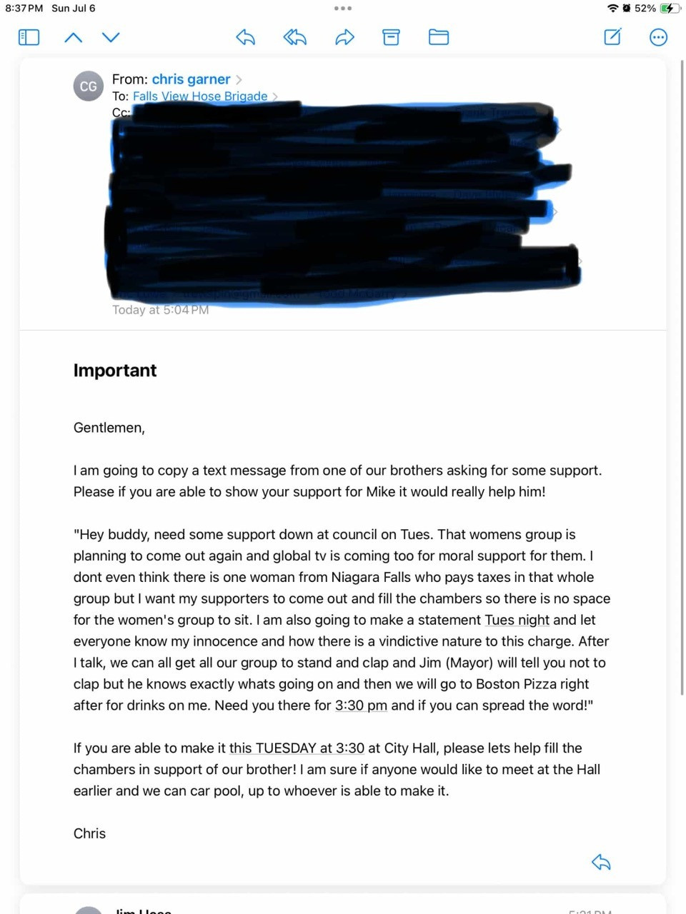 A copy of the message sent by Councillor Mike Strange to members of the Falls View Hose Brigade in July.