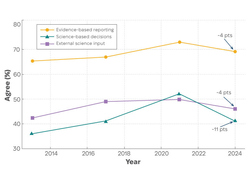 In 2021, the majority of scientists felt their evidence shaped policy, indicating that the post-2015 culture of consultation was effective. By 2024, confidence had dropped to 44 percent, signalling recent gains in transparency and consultation were being eroded. A 2025 Professional Institute of the Public Service of Canada report emphasized this decline has broader consequences: when scientists doubt that evidence informs decisions, the public loses a critical early-warning system for emerging threats.