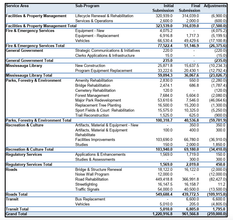 The deferred items include $59.7 million in Parks, Forestry & Environment work; $109.9 million for roads; $26.3 million for Fire & Emergency Services; $23 million for Mississauga Library; and $34.4 million for Recreation & Culture spending.