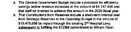 The approved 2026 budget includes more shell games: according to the motion approved Friday, the internal loan will be paid back by the “2nd Hospital Levy subsequent to fulfilling the $125 million commitment to William Osler” which manages Peel Memorial, along with Brampton Civic Hospital and is responsible for raising $250 million for the Memorial expansion. It asked City Hall to cover half this amount, a common arrangement in municipalities to support the construction of new healthcare infrastructure. What is not common is taxpayers being asked to pay for this badly needed new healthcare project, only to see Brown lend that money to cover costs completely unrelated to Memorial’s expansion.