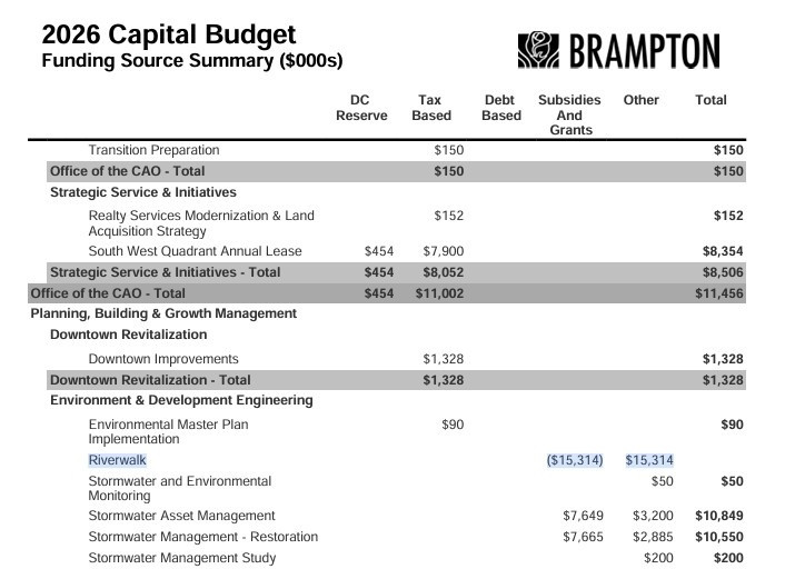 Neither of these two projects is mentioned in the capital section of Brown’s budget; they are only listed in the Funding Sources Summary section. The transit facility requires $50 million in 2026, which was initially planned to be paid through development charges, but now, in this year’s budget, that amount will be covered by debt. The long-delayed Riverwalk project, a vital initiative to fix the downtown’s flooding problem and to revitalize the city centre, has $15.3 million outlined in the budget, which was supposed to be covered through subsidies and grants as previously planned; instead, the funding source is not known, simply mentioned as “other” in Brown’s budget.