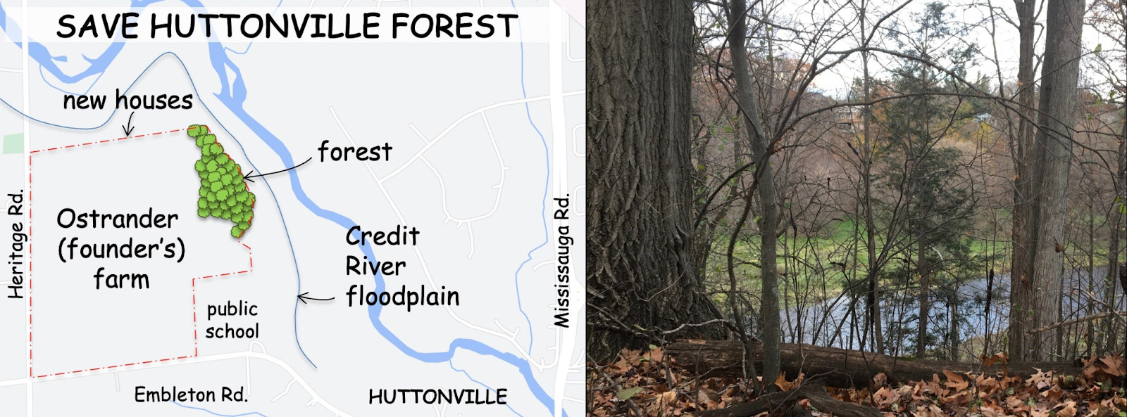 Huttonville Forest, covering 2.6 hectares, roughly the size of 17 NHL hockey rinks, stretched 300 metres along the south edge of the Credit River behind Huttonville’s oldest farm at Embleton Road and Heritage Road.